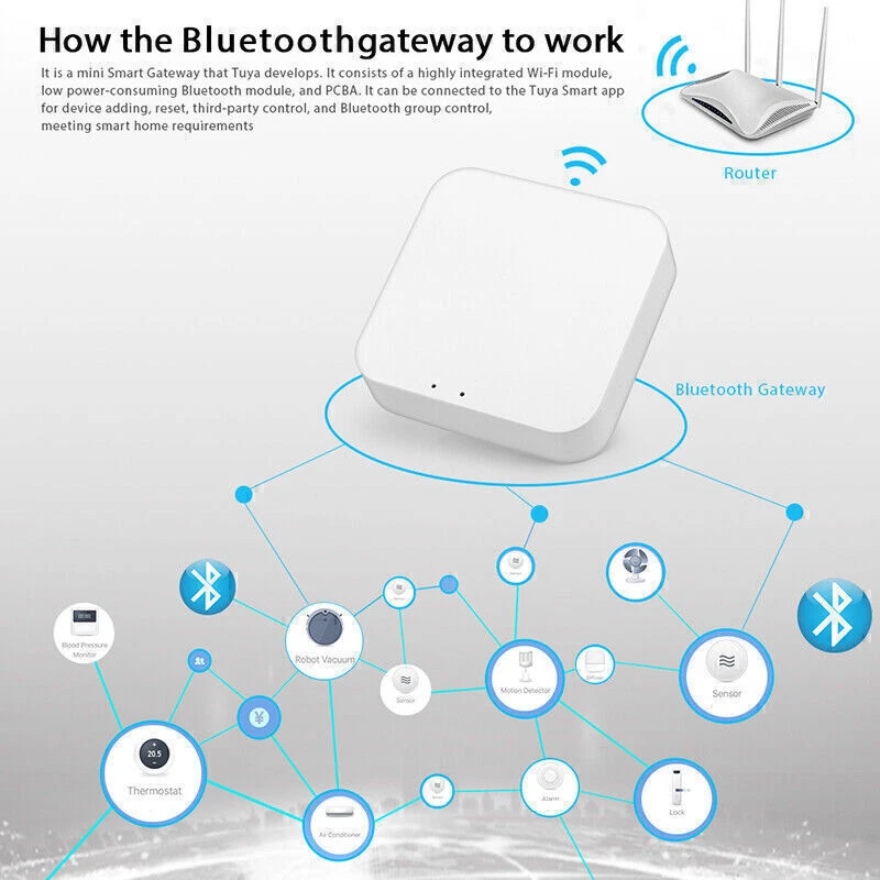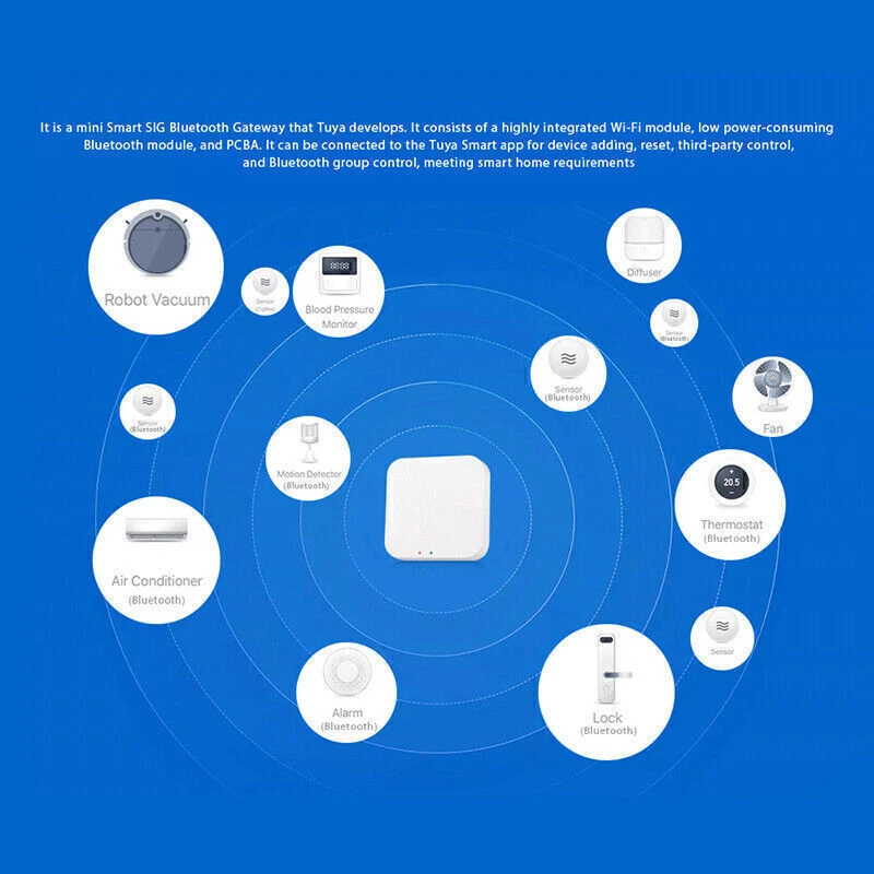 Product Description If you have any questions, please contact customer service first, do not open disputes easily, thank you! Features: 1. Remote control on smart life APP through mobile phone network or WIFI. 2. Used with other Bluetooth SIG devices to implement automatic scene application. 3. Wireless connection indicator. Specification: Status indicator: 2 LEDs (WIFI + Bluetooth) Operation keys: 1 button (reset) Power supply: Micro USB DC5V Working current: <1A Working temperature: -10-55 ℃ Working humidity: 10% -90% RH (non-condensing) Storage temperature: -20-60 ℃ Storage humidity: 5% -90% RH (non-condensing) Hardware interface: 1 Micro-USB Wireless technology: WIFI 802.11 b / g / n Bluetooth: 5.0 Antenna type: Built-in onboard antenna Size: about 61 * 61 * 16mm Weight: about 80g Packing list: 1 * Bluetooth gateway 1 * Manual 1 * Data cable About Us We accept all payments authorized by eBay. powered by