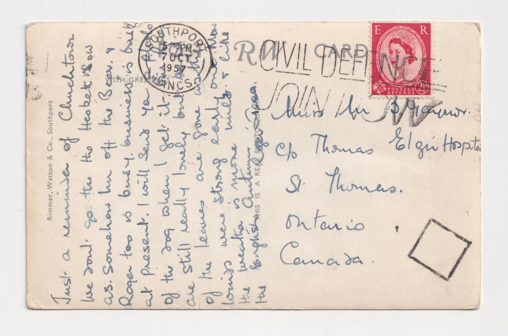Shipping to the UK is combined, $3.50 for one or more cards per shipment. We have hundreds of UK cards listed. Charges in excess of $3.50 per shipment will be refunded. We add a perimeter in the scans to fully show corners and edges. Posted 1957, condition as per scans, fairly nice. Please look carefully at front and back scans to ascertain condition; flaws, if any, will show in scans. Authentic, original, period card, we sell no reproductions. Satisfaction guaranteed or money refunded. We ship in a plain envelope. Free shipping to the US. Shipping for one or more cards to Canada is US$1.55, to other countries for one or more cards, US$3.50. Foreign shipping combined. Although we appreciate advice on modifying our business plan and managing our cash flow, we do not respond to offers. Thanks.