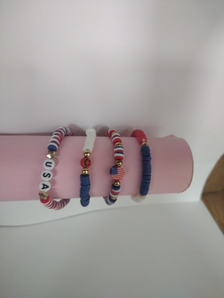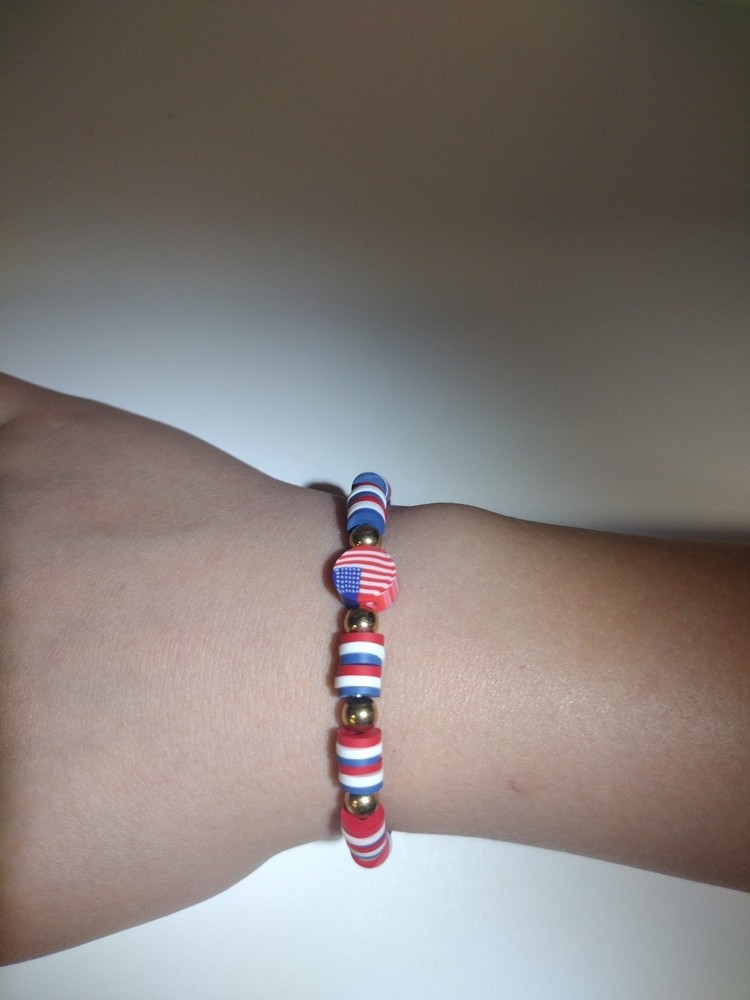 These USA flag themed clay bead bracelets are handmade in the United States, making them a unique and patriotic accessory for kids on fourth of July day! The beaded style and stackable feature add versatility to the design, allowing for personalized style. With a charm type of bead and no stone as the main stone, these bracelets are perfect for those looking for an inspirational or awareness-driven piece of jewelry. Made from clay beads these bracelets offer a natural and meaningful addition to any jewelry collection.