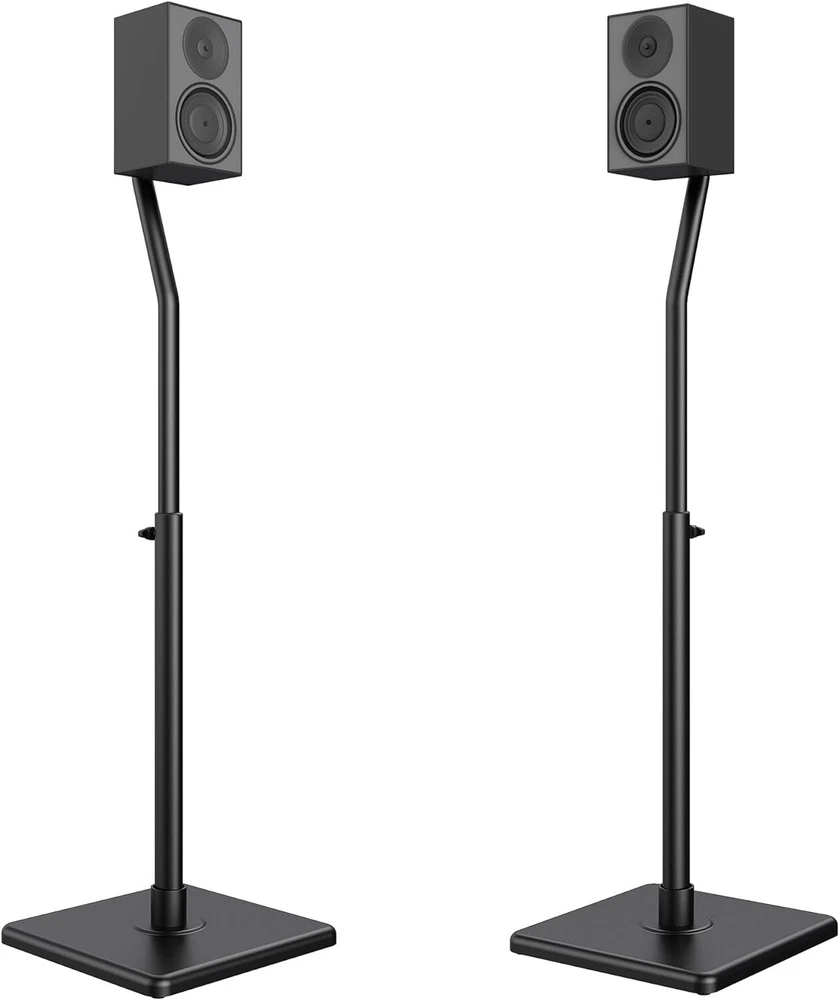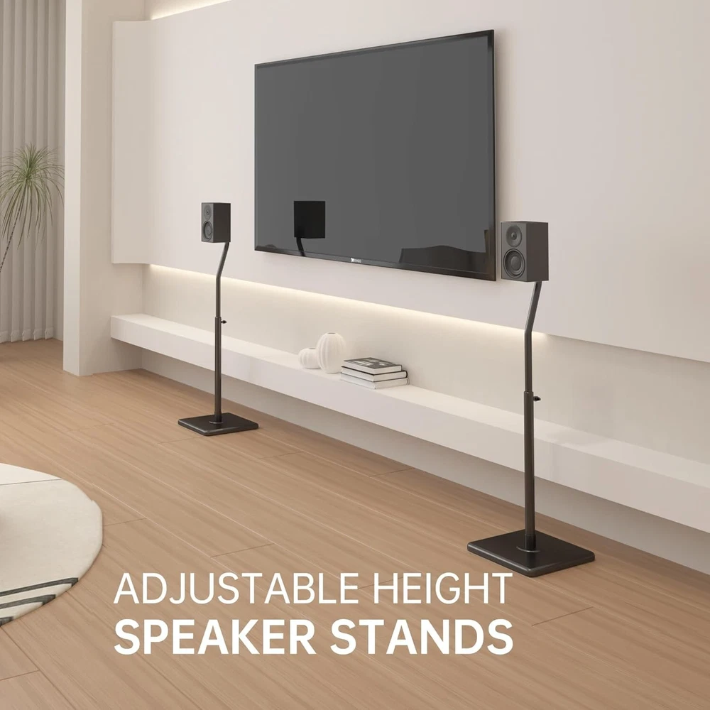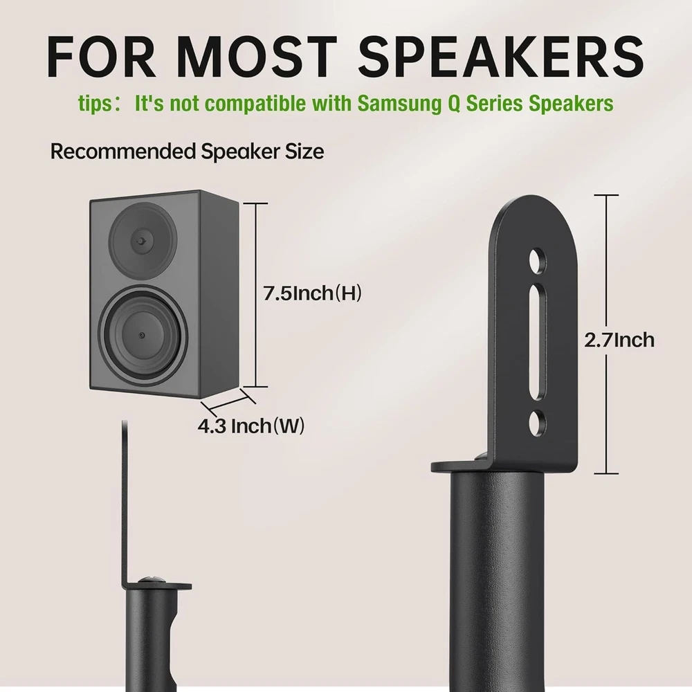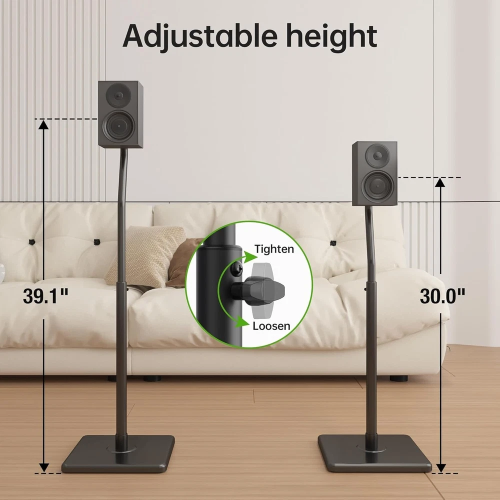 USX MOUNT Universal Speaker Stands, Height Adjustable Extend 30.0" to 39.1" for Satellite Speakers & Small Bookshelf Speakers up to 11 lbs Per Stand, 1 Pair Floor Stands for Sony Bose Polk JBL Yamaha HEIGHT ADJUSTABLE SPEAKER STANDS:This speaker stands use the collar to adjust height from 30.0" to 39.1" to get your sound speakers the desired height and enjoy stereo or surround sound. Placing the bookshelf speakers stands on the appropriate height can also reduce reflections to give you a purer and more clear sound. COMPATIBILITY&MULTI INSTALLATION OPTIONS:The surround sound speakers stand fit back screw hole /key hole.The height 2.7" to fit your various speakers of different sizes with different holes. WARM TIPS: Please make sure there are holes on the back the speaker to lock the screws before purchase. The metric screws came with the stand do not fit for Samsung HW-Q90R. STURDY SQUARE BASE:The floor speaker stands is constructed from high quality steel materials which is sturdy enough and durable. The square base of the rear speaker stands is more stable and the weight capacity up to 11lbs/5kg per stand. No worries about it tipping over. Rubber feet for wooden, cement, tile or other hard floor. If the stand is placed on carpet, install the carpet nail. CONVENIENT TO USE &US Based Customer Support :This speaker stands pair include all the required hardware and easy instructions, you can assemble it within few minutes. The speaker floor stands can be easily to move to your living room, bedroom and study room. Our team will provide pre-sales and after-sales service online or by phone regarding product suitability or installation problems. CABLE MANAGEMENT:The floor speaker stands keep cables clean and organized with internal channel ( 0.6“ W x 1.2” H) for a clean and tidy appearance. Or external velcros in package to help run the cable around the stand tube.