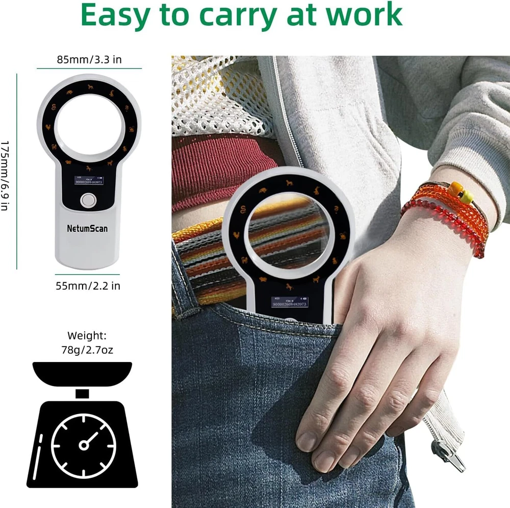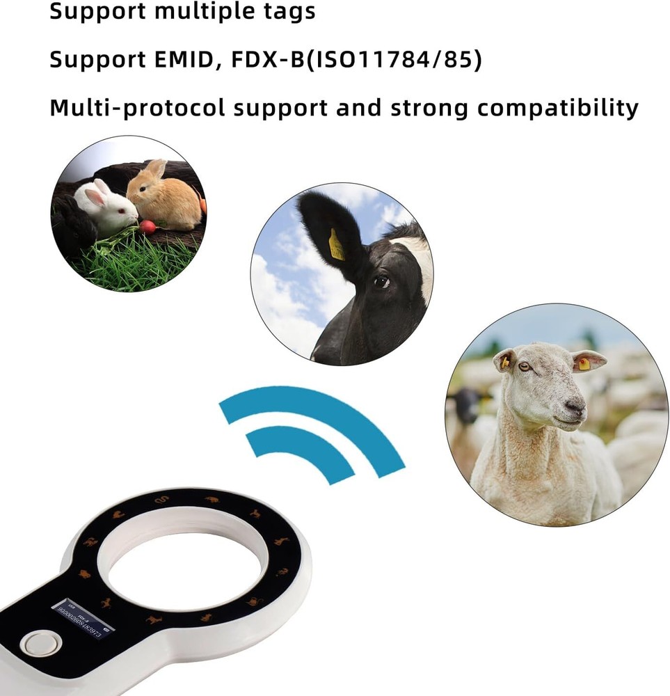 About this item 🐻 Support multiple protocols - The handheld reader supports ISO 11784/11785, FDX-B, and ID64 RFID, easy to operate with one button to read. NOTE: 1. Please confirm the frequency efficiency and compatibility of your electronic tag before purchasing. Does not support FDX-A protocol. 2. The reader cannot read AVID microchip. 🐻 Wider Data Read Range - 5-30cm reading range, extremely fast scanning. Save up to 1024 tag information, which can be uploaded to a computer via USB cable. 🐻 OLED Display - High brightness display makes it convenient to read. OLED screen is readable in sunlight. 🐻 Built-in rechargeable lithium battery - No need to replace the battery, easy to operate, can be charged via USB interface. If no tags are scanned, the device will shut down automatically after 180 seconds or can be manually turned off by pressing the button for 3 seconds. 🐻 Portable and lightweight - Product size: 7.91 x 4.25 x 1.5 inches, lightweight and easy to hold with one hand. Convenient for animal management, farm management, railway inspection, and more. Product dimensions: 7.91 x 4.25 x 1.5 inches
