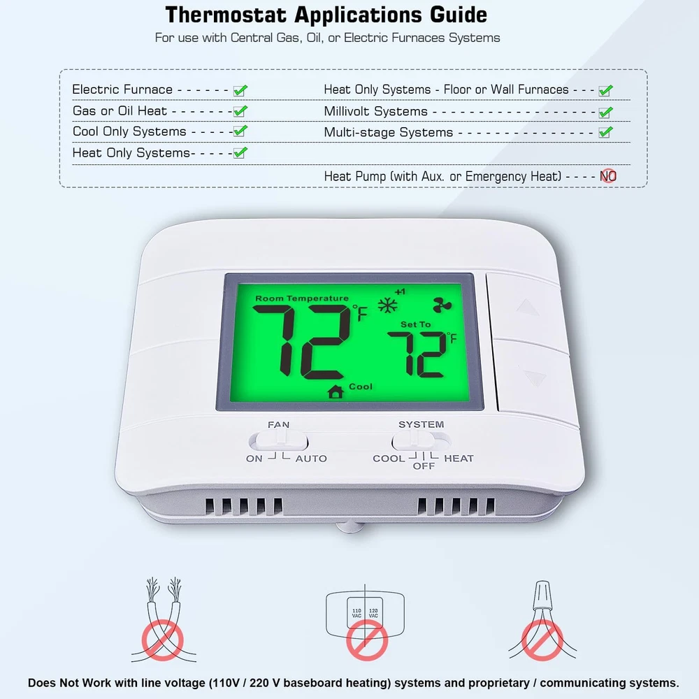 Non programmable thermostat, multi-stage, 2 heating and 2 cooling, electric or gas/oil configurable. (TIPS: before purchasing, check to see if this thermostat is compatible with your old thermostat) Compatible with the following systems: gas, oil or electric furnaces, millivolt system, central heating and cooling system. NOT COMPATIBLE with the following systems: RV thermostats, Heat pump systems, Aux heating, Emergency heating, 120/240v electric baseboard and line voltage systems. Easy to read and use: Large digital display with large characters and green backlight. separate buttons for easy setpoint temperature, very suitable for middle-aged and elderly people to use. Upgrade function: The thermostat with humidity and temperature monitor to ensure you’re always aware of changes in your home environment. It gives precise temperature control with +/- 1 degree in Fahrenheit and Celsius for ultimate consistent control to keep you comfortable. Easy installation and the battery is easy to replace, with dual powered by 24VAC power or 2*AAA batteries, C-wire is not required. built-in low battery reminder, compressor delay protection and more. Please contact us at once if any quality problem, come with 2-years warranty and 24h customer service.
