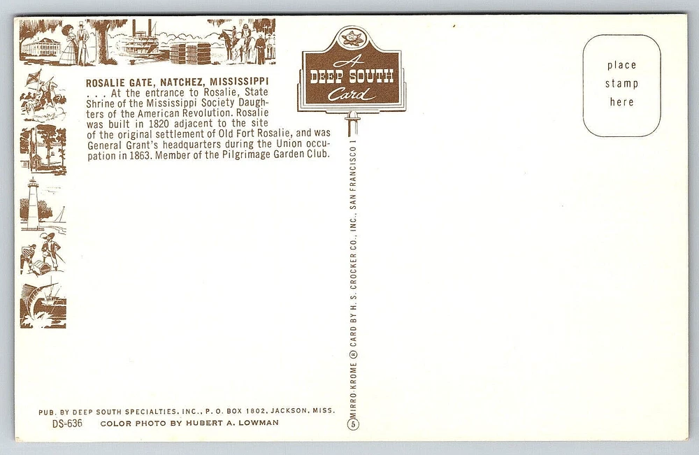 Posted: No Size: Standard (5.5 x 3.5 in) Brand/Publisher: HS Crocker Finish: Glossy Subject: Cities & Towns Location: Natchez, Mississippi USA Country/Region of Manufacture: United States Region: Mississippi City: Natchez, Mississippi gtin13: DOES NOT APPLY Time Period Manufactured: NA Theme: Architecture, Cities & Towns, Community Life, Domestic & Family Life, Famous Places, Historical Figures, Landscapes, Photographs, Roadside America, Seasons, Social History, Tourism, Postcard, Antique, Vintage, Ephemera, Collectible, Memorabilia, Old, Retro, History, Card, Mail, Paper Material: Paper Occasion: Postcard Original/Licensed Reprint: Original Vintage: Yes Number of Items in Set: 1 Franchise: Postcard Postage Condition: Unposted Orientation: Horizontal UPC: DOES NOT APPLY Character: Postcard Country: United States Antique: Yes Era: Divided Back (1907-1915) Color: Multicolor Artist: Postcard Continent: North America Seller Notes: “Good Vintage Condition. See Pictures And Description Closely For Details.” Unit of Sale: Single Unit Signed: No Signed By: None Featured Person: None Features: Divided Back, Original Genuine Antique Vintage Postcard Stamp: No Type: VINTAGE OLD ANTIQUE POSTCARD ROSALIE MANSION HOUSE GATE LANDMARK