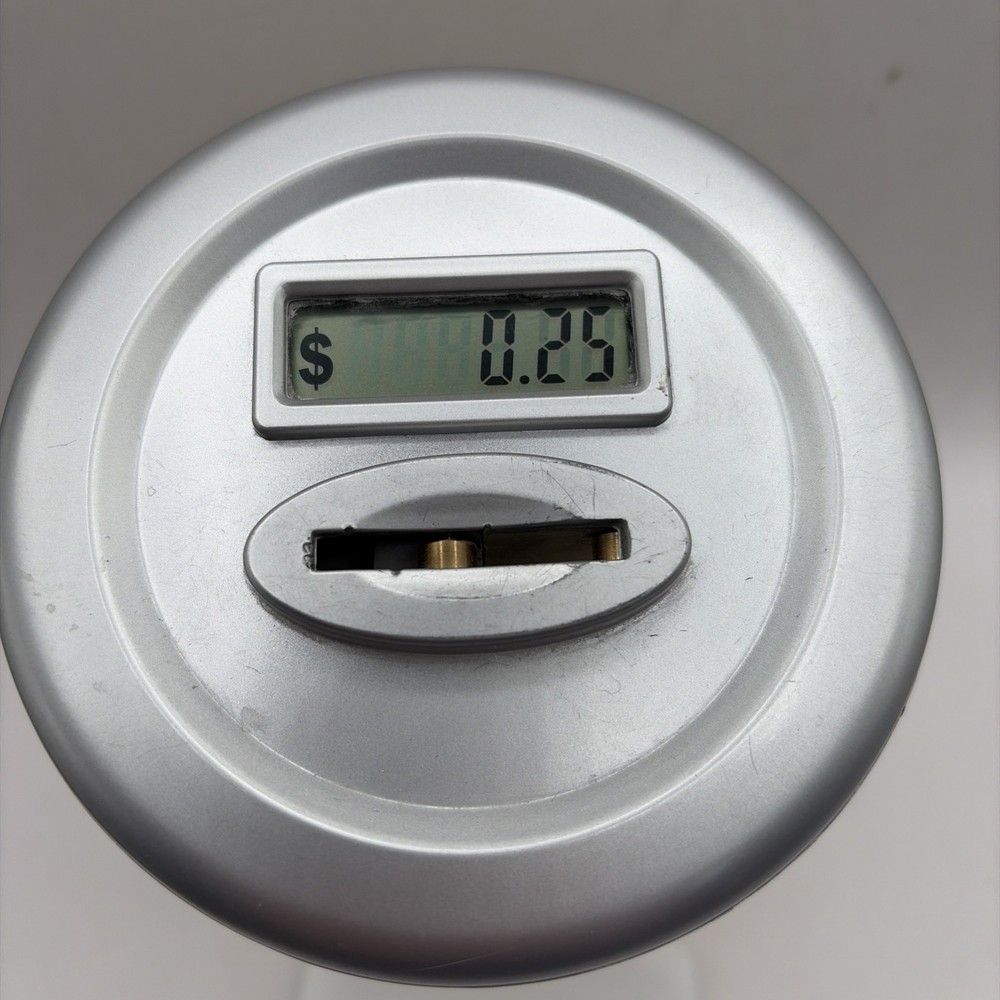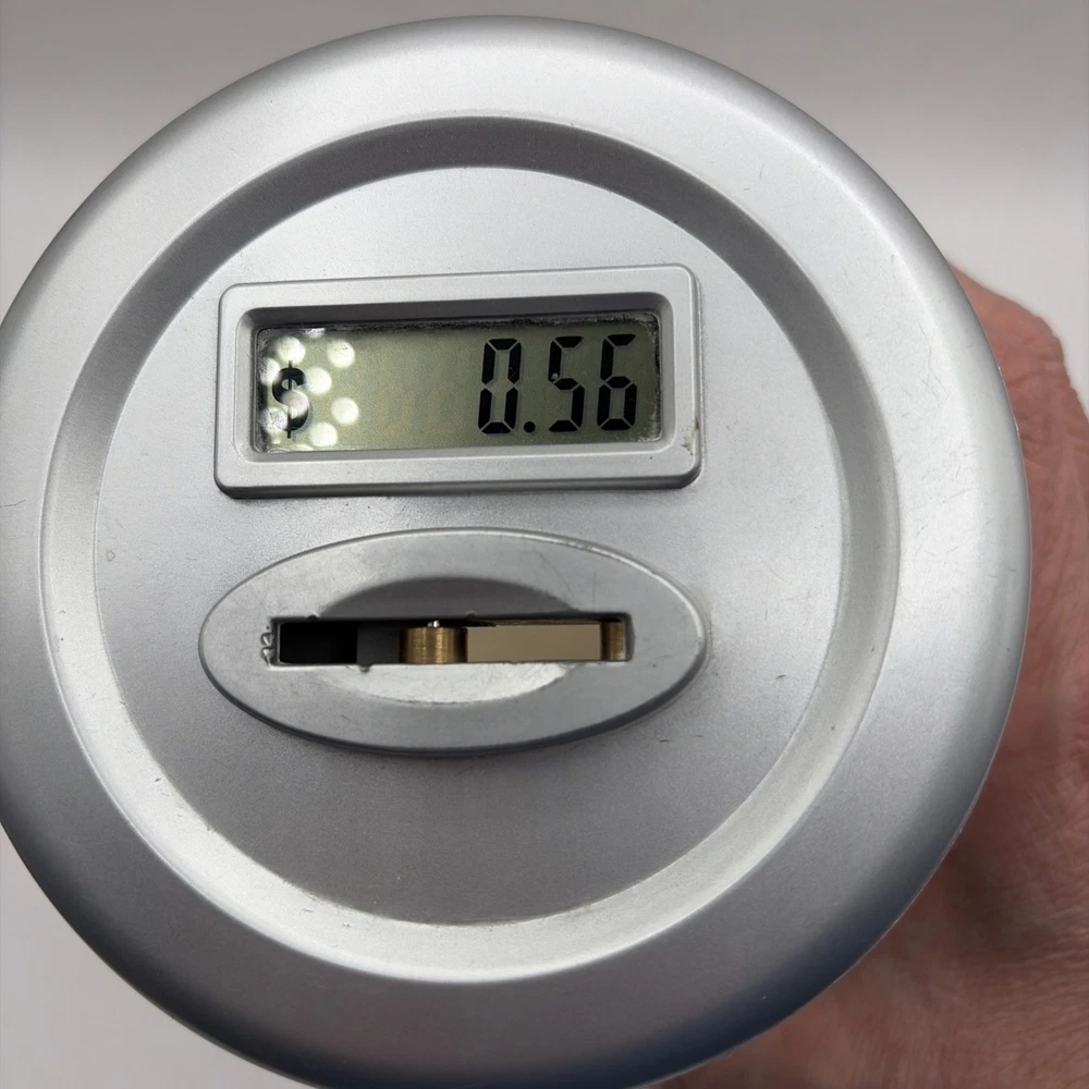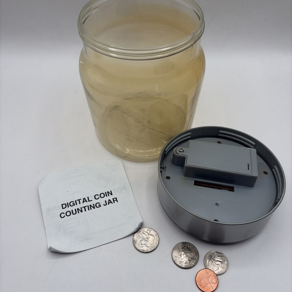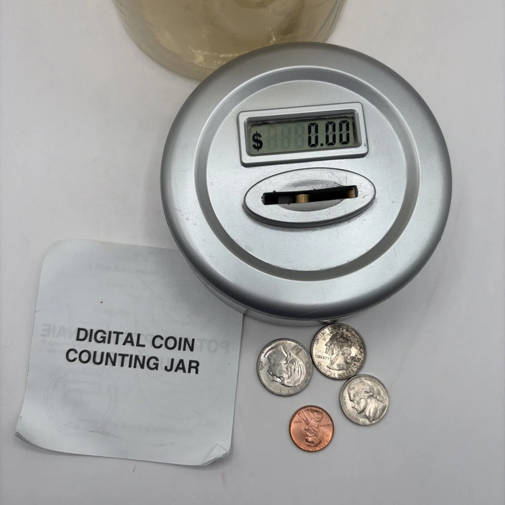 This tested and working 2006 Digital Piggy Bank Coin Savings Counter by E&B Giftware is a convenient and practical tool for counting up your saved coins as you go. This coin counter operates on 2 AA batteries (not included) and features a digital counting system. Made of ABS and PC materials it has a silver look top and smoked plastic base. This money-saving jar has a large coin capacity. Fastest way to reset the total to zero is to remove battery momentarily. Instruction booklet included with another way to reset. Please see photos, noting that it added the total after each coin (coins not included). Great for kids learning to save and add.