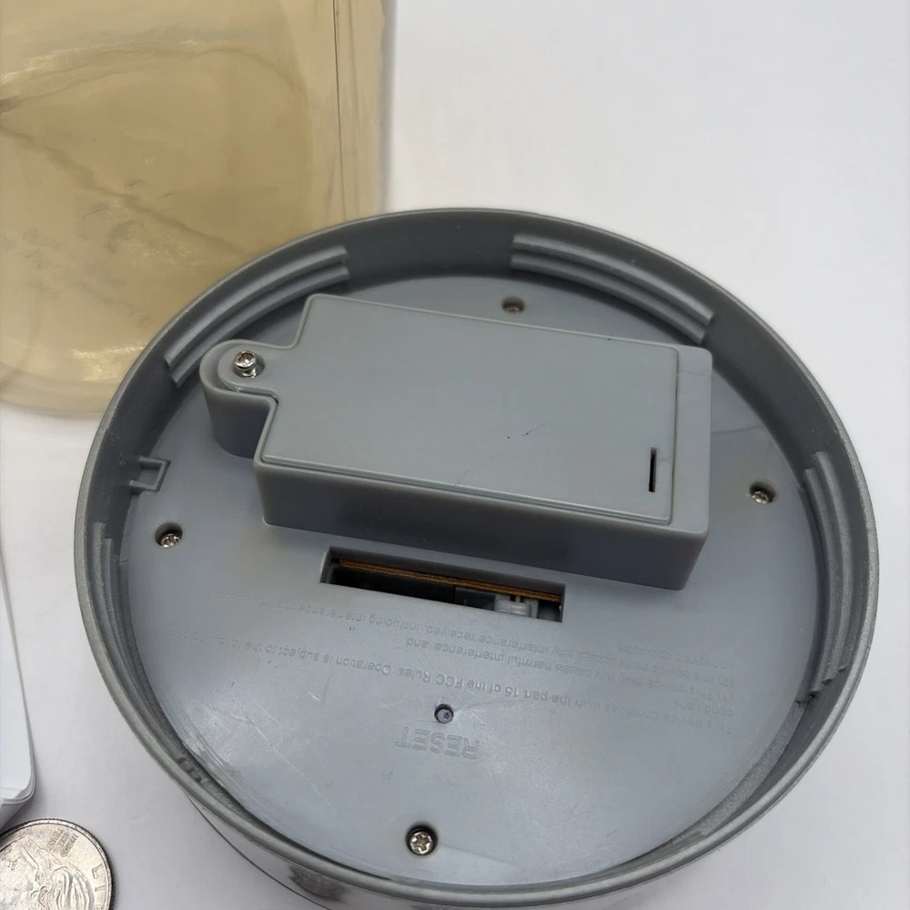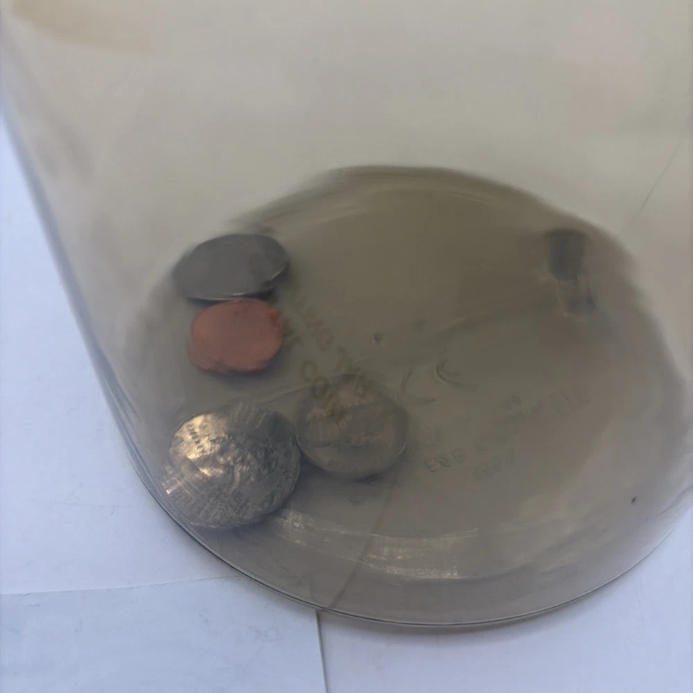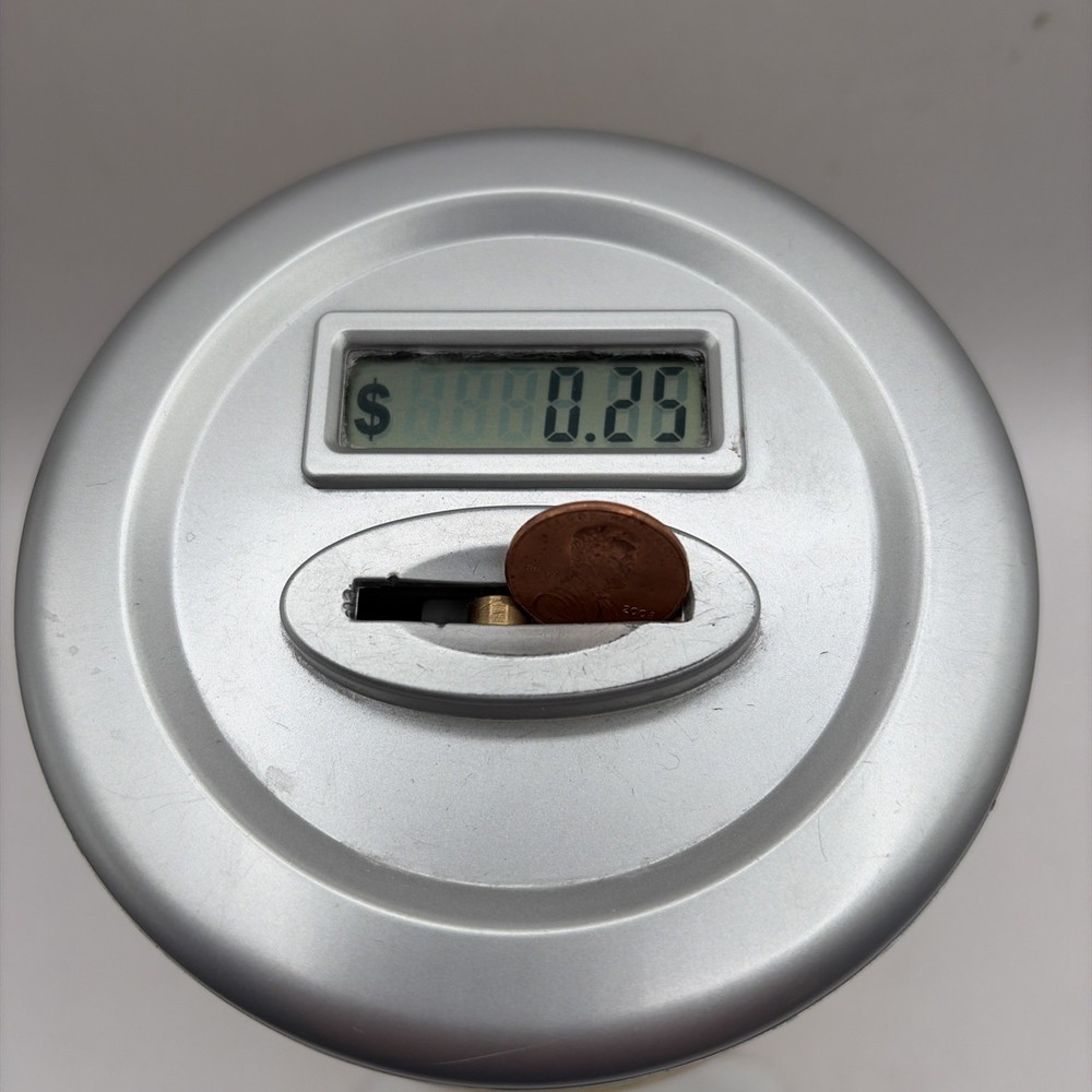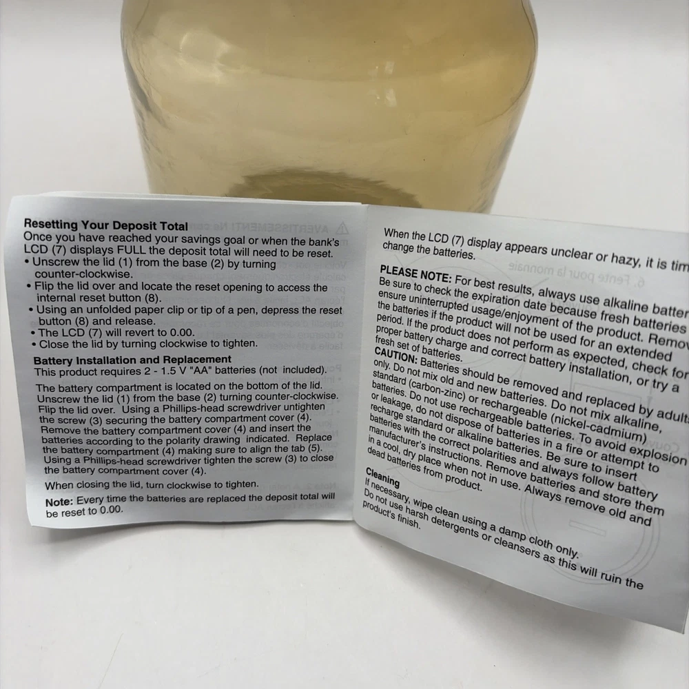 This tested and working 2006 Digital Piggy Bank Coin Savings Counter by E&B Giftware is a convenient and practical tool for counting up your saved coins as you go. This coin counter operates on 2 AA batteries (not included) and features a digital counting system. Made of ABS and PC materials it has a silver look top and smoked plastic base. This money-saving jar has a large coin capacity. Fastest way to reset the total to zero is to remove battery momentarily. Instruction booklet included with another way to reset. Please see photos, noting that it added the total after each coin (coins not included). Great for kids learning to save and add.