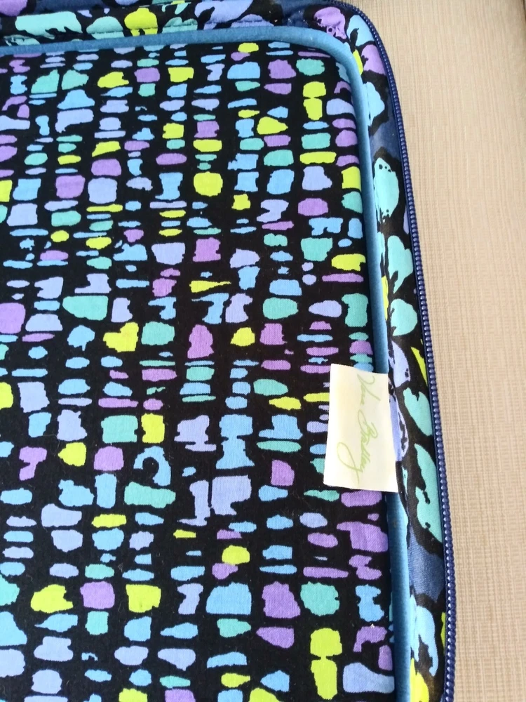 Bag has full length zipper closure pocket on the front and full length slip in pocket in the back Detachable adjustable shoulder strap Will hold loptop measuring 16"×11" or less Bag is in good condition with no stains or wear of fabric