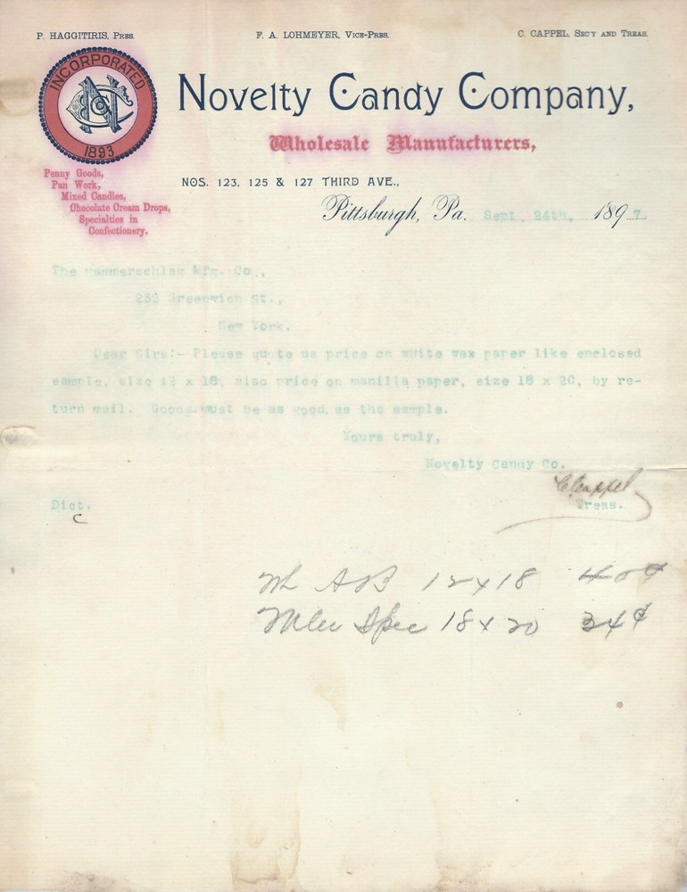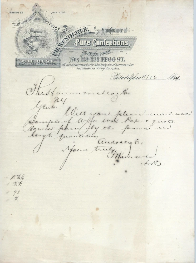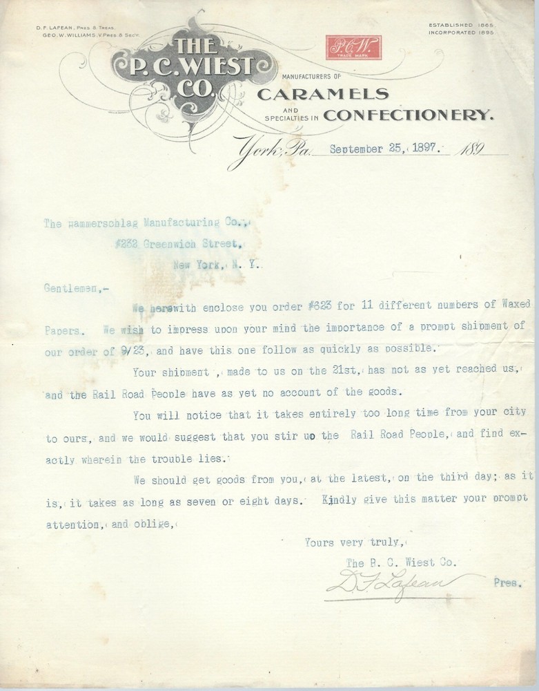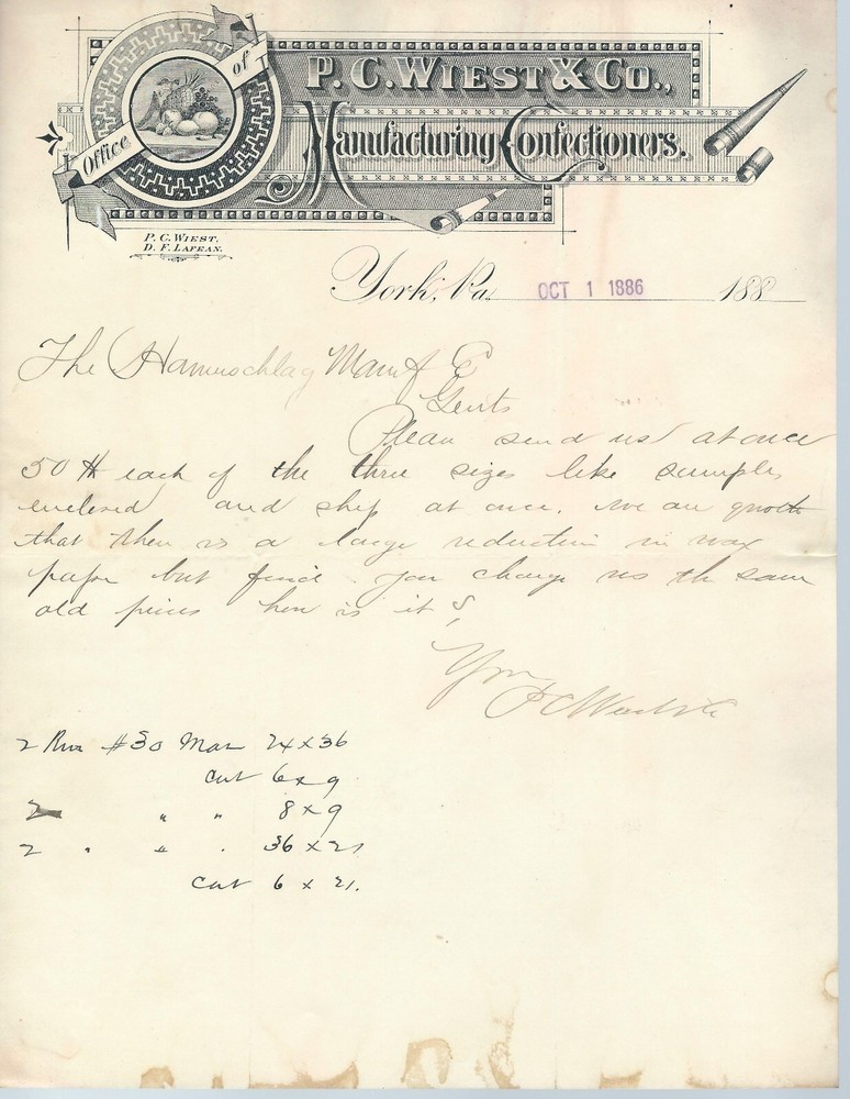 This is a lot of 5 letters to Hammerschlag Mfg. from various companies circa 1890's. Novelty Candy Company, Pittsburgh, PA - 1897. Three from P.C. Weist Co. York, PA - 1897, 1886, 1895. P.H. Wunderle Philadelphia, PA - 1894. Excellent condition - see scans. Free Shipping!! The American Caramel Company grew out of an industry established by Peter C. Wiest in 1867. He was a pioneer in the manufacture of caramels and soon developed a successful business. The American Caramel Company was created on March 28, 1889, when the Breisch-Hine Co. of Philadelphia and the P. C. Wiest Co. of York, Pennsylvania, merged. After acquiring the Lancaster Caramel Company in 1900, the American Caramel Company became famous by including baseball and other cards in with its candies. With the addition of the Lancaster Caramel Company, the American Caramel Company grew to control 90% of the caramel in the country. The American Caramel Company was one of the early businesses to issue of Baseball Cards with their product. In December 1928, The American Caramel Company shut down the York Plant, moving the candy making machinery to a more modern facility.