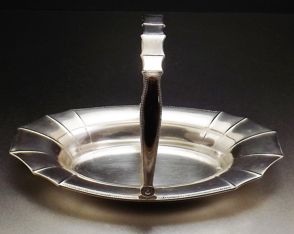 Petite coupe Art Déco. *** En métal argenté . *** Orfèvrerie WMF en Allemagne. *** Epoque années 1920. *** Dimensions : longueur 210mm, largeur 120mm, hauteur 135mm. Poids : 180 grammes. Description : Petite coupe à anse panier Art Déco en métal. De forme ovale avec anse mobile et décor de perles. Orfèvrerie Allemande WMF. Poinçons et marquages : Poinçons de l'orfèvrerie WMF avec le kangourou. Etat : En parfait état, (voir photos).