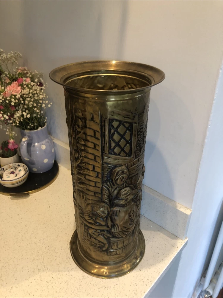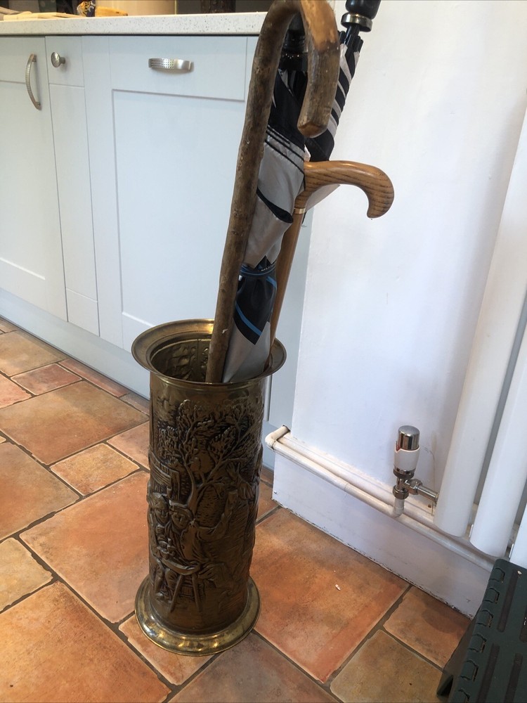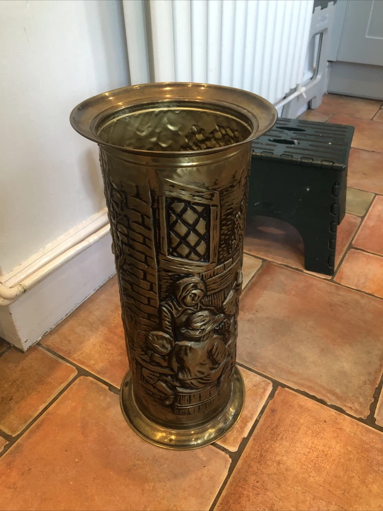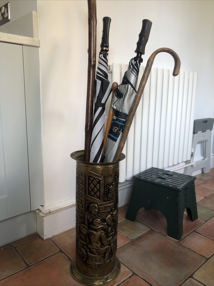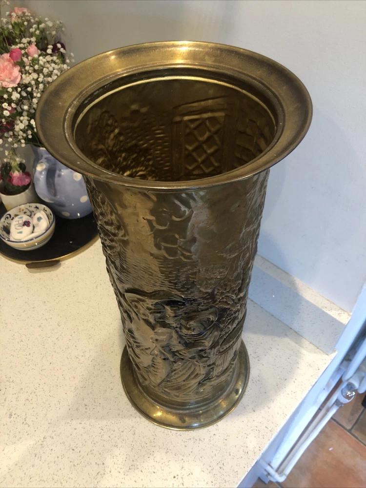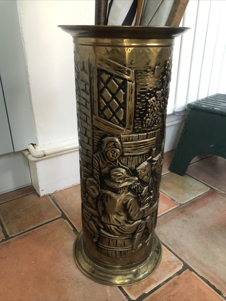 Lovely old genuine English Vintage solid Brass heavily embossed English Bar pub tavern Scene depiction decoration Umbrella Stick Stand Cane Holder Storage Bin in VGC - no dents / damage / holes /rot / decay Nice patina No makers mark believe made early to mid 20th century - bottom is stamped ‘MADE IN ENGLAND’ Height 47cm Diameter outside edge 21cm Diameter inside edge (actual hole size) 16cm Weight 1.1kg Fair start price and no reserve Please have a look at our other vintage retro item auctions. We will combine postage prices if at all possible. Welcome to collect from Leicester to save postage. (3 miles from junction 21 of the M1 Motorway)