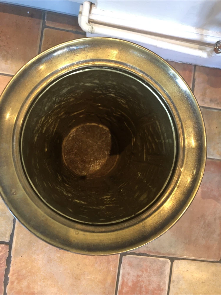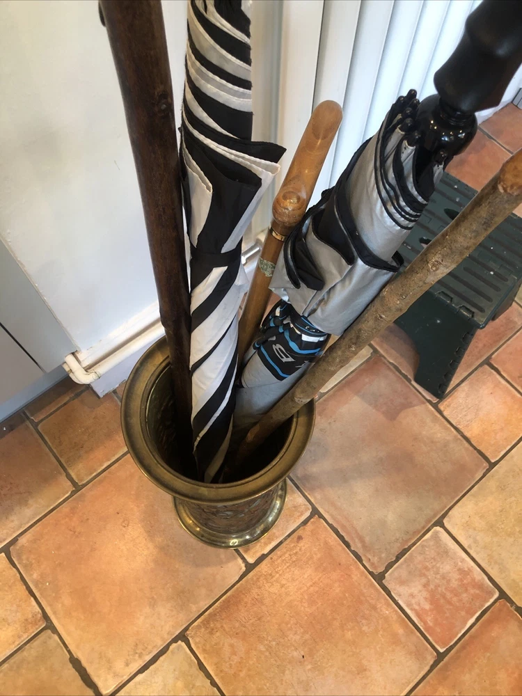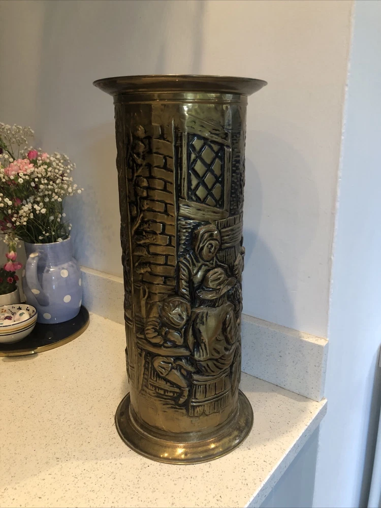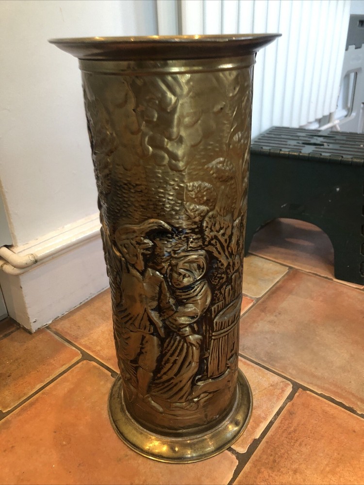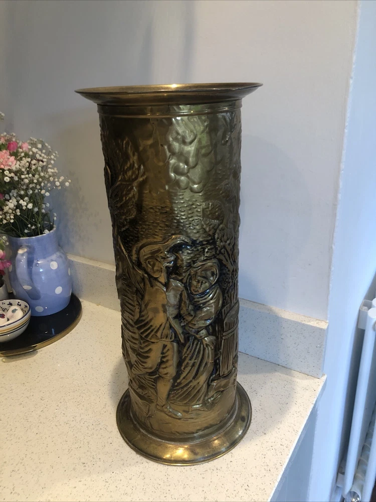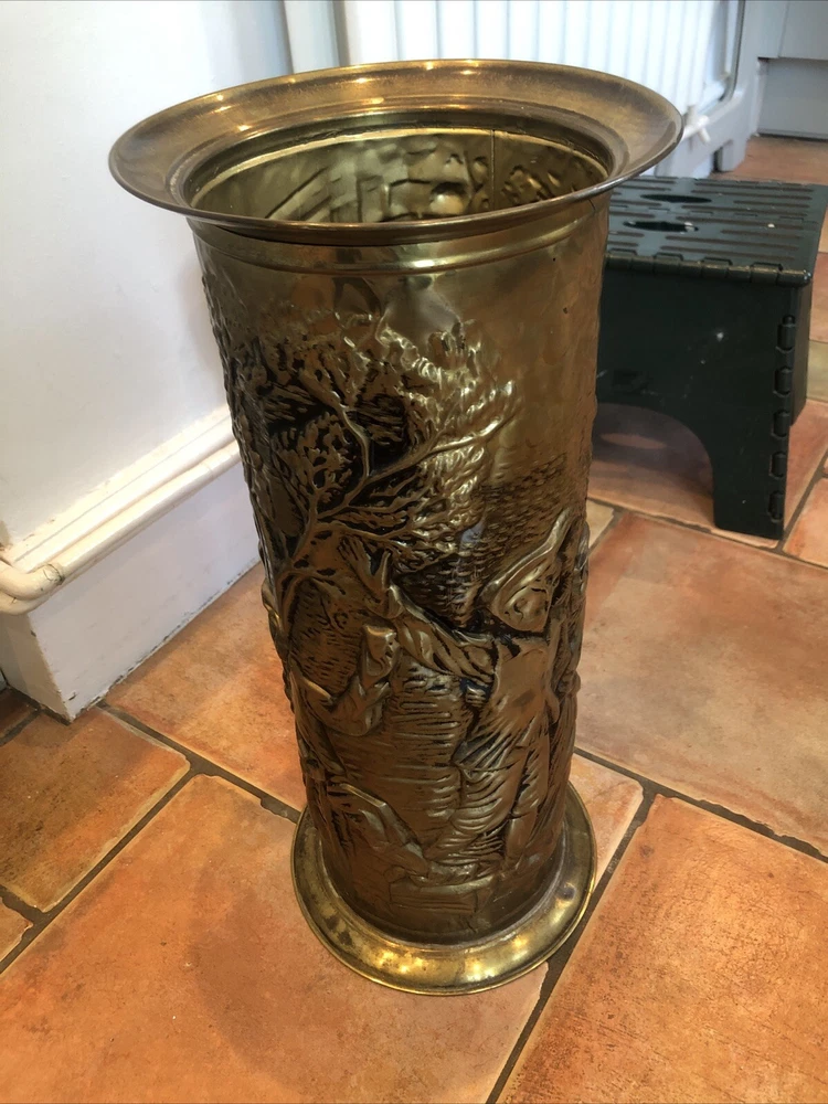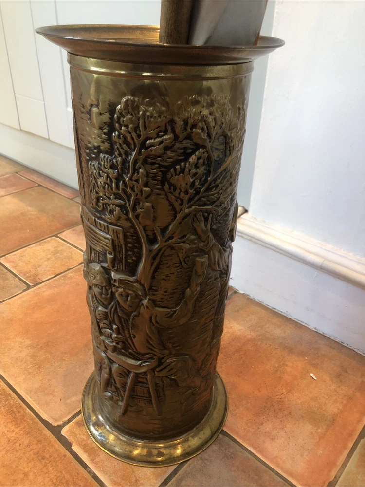 Lovely old genuine English Vintage solid Brass heavily embossed English Bar pub tavern Scene depiction decoration Umbrella Stick Stand Cane Holder Storage Bin in VGC - no dents / damage / holes /rot / decay Nice patina No makers mark believe made early to mid 20th century - bottom is stamped ‘MADE IN ENGLAND’ Height 47cm Diameter outside edge 21cm Diameter inside edge (actual hole size) 16cm Weight 1.1kg Fair start price and no reserve Please have a look at our other vintage retro item auctions. We will combine postage prices if at all possible. Welcome to collect from Leicester to save postage. (3 miles from junction 21 of the M1 Motorway)
