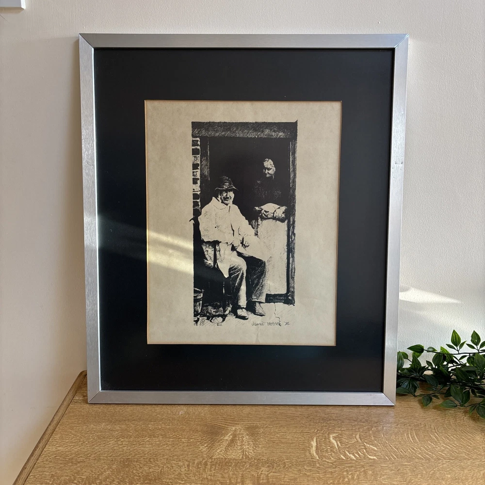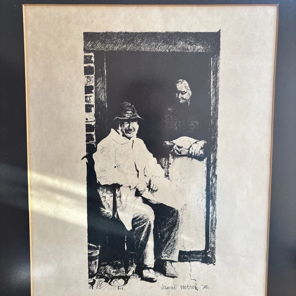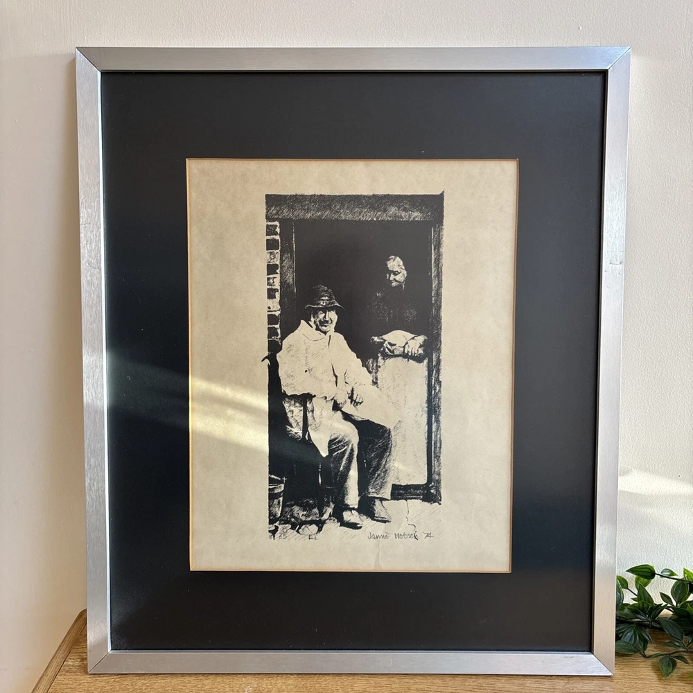 This is a vintage framed print by Jamie Hobson, dated 1974. The artwork is a black-and-white illustration, capturing an intimate and thought-provoking scene with two figures. The striking detail and composition highlight Jamie Hobson's skill as an artist, making this piece a timeless addition to any collection or decor. The artwork is framed with a black mount and a sleek silver frame, perfectly complementing the vintage aesthetic. The frame measures 46 cm wide by 54 cm high , making it a versatile and ideal size for display in various spaces. This print is in excellent vintage condition, with some minor wear to the frame that adds to its charm and authenticity. Details : Artist : Jamie Hobson Year : 1974 Medium : Print Subject : Seated figures in an intimate setting Frame Dimensions : 46 cm wide x 54 cm high Frame : Black mount with silver outer frame Condition : Excellent vintage condition with minor wear on the frame Style : Black-and-white illustration This vintage Jamie Hobson print is ideal for collectors, art enthusiasts, or anyone looking for a unique and characterful piece of vintage decor. We take great care to provide accurate descriptions, and we encourage you to thoroughly review the accompanying photos for a comprehensive understanding of the item's details. If you have any questions or need additional information, please don't hesitate to reach out to us.