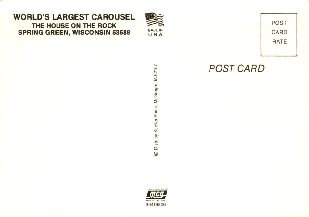 MAKE AN OFFER. THE MORE YOU BUY THE BETTER DEAL I WILL ACCEPT The postcard features the World's Largest Carousel located at The House on the Rock in Spring Green, Wisconsin. The carousel is a major attraction at this unique tourist destination. The House on the Rock is a complex of architecturally unique rooms, streets, gardens, and shops designed by Alex Jordan Jr.