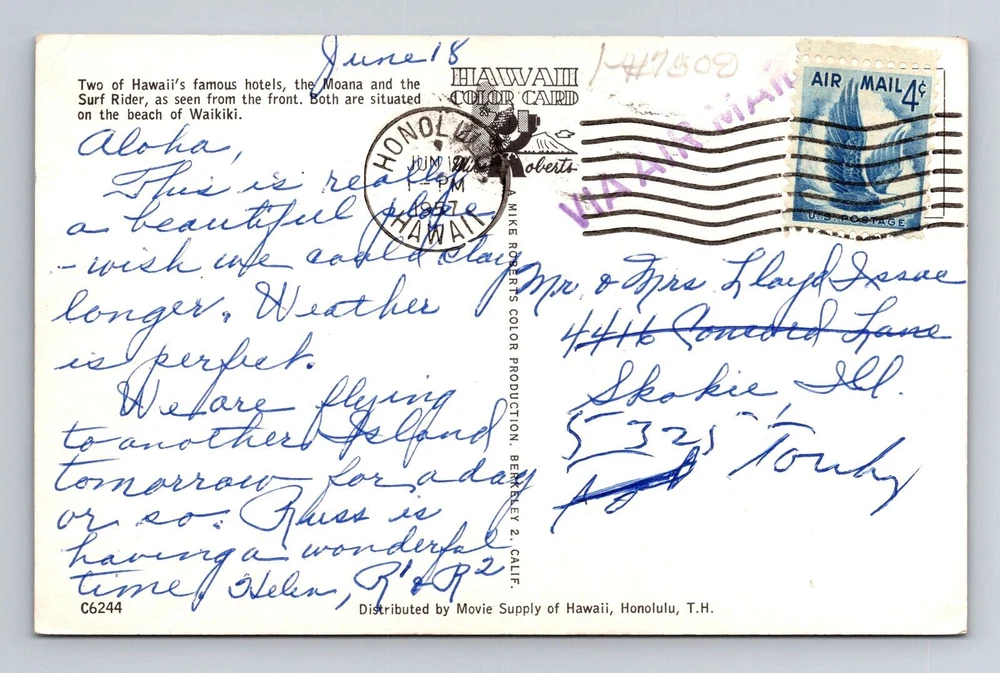 Waikiki HI-Hawaii, Moana and Surf Rider Hotels, Antique Vintage Postcard