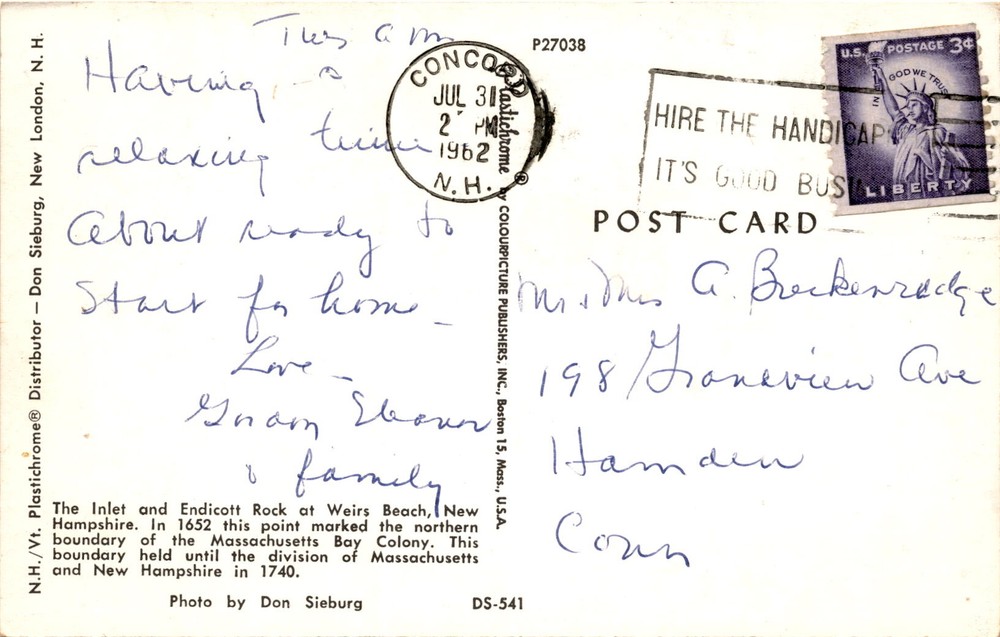 MAKE AN OFFER. THE MORE YOU BUY THE BETTER DEAL I WILL ACCEPT The postcard features a scenic view of The Inlet and Endicott Rock at Weirs Beach, New Hampshire. The image showcases a historical site where in 1652, the point marked the northern boundary of the Massachusetts Bay Colony, a boundary that remained until the division of Massachusetts and New Hampshire in 1740.