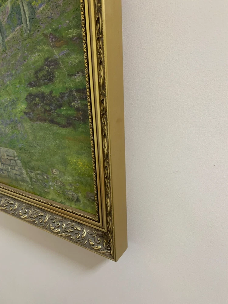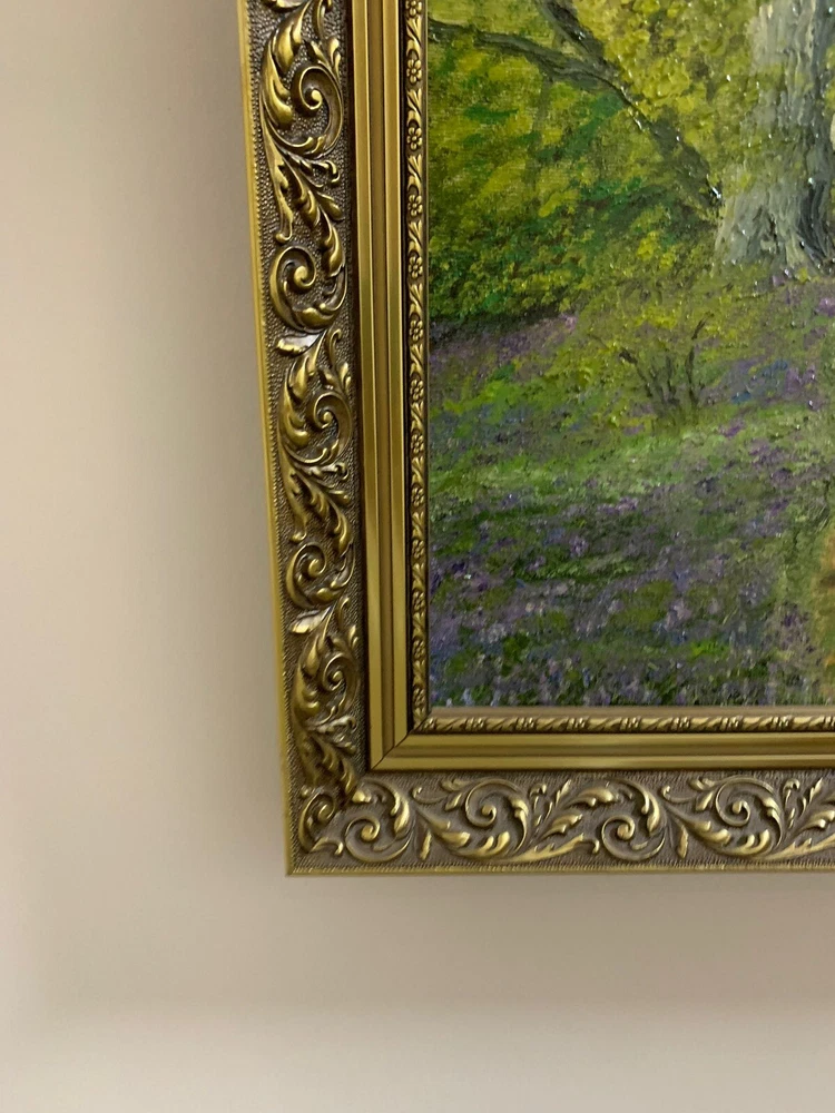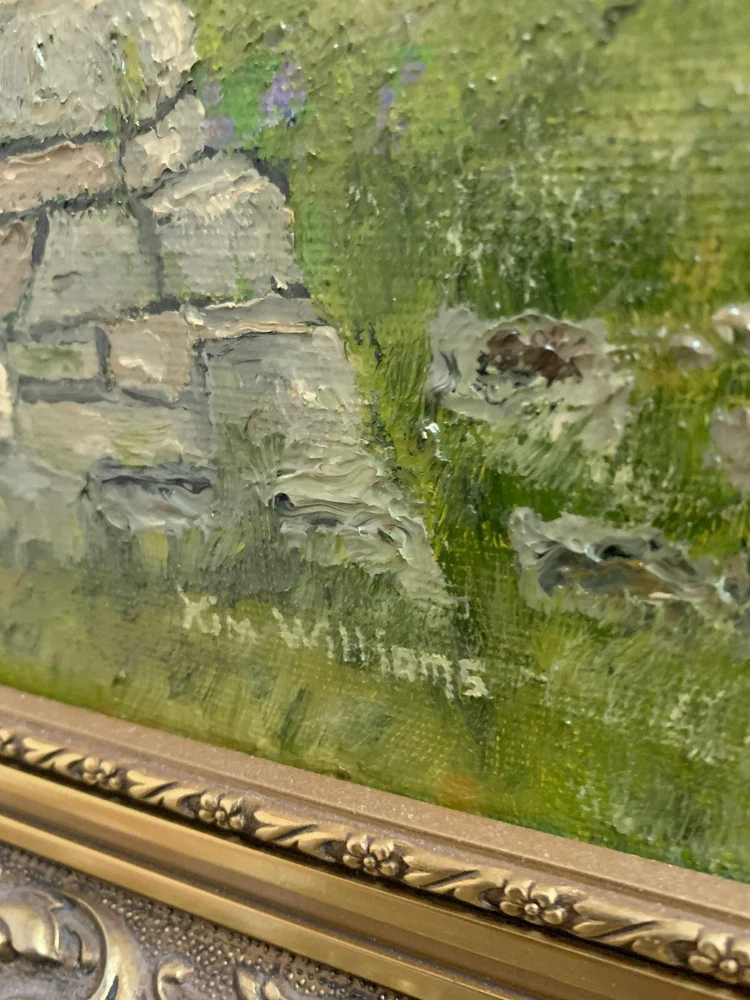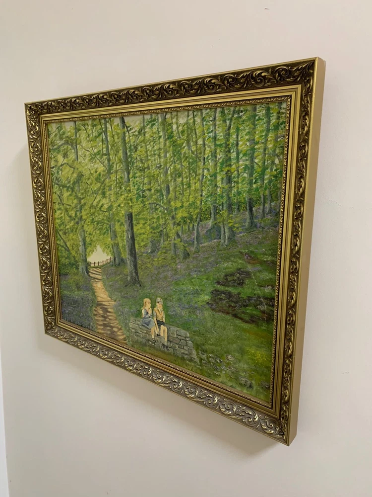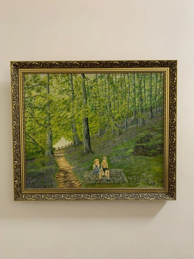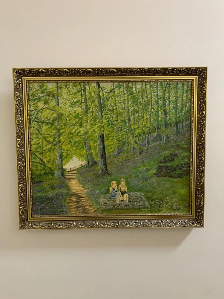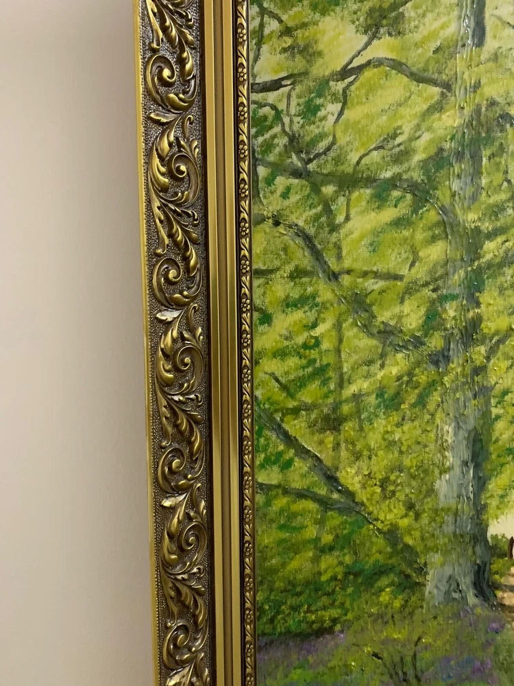 This stunning artwork by Reverend Kim Williams beautifully captures the tranquility of a woodland scene. The painting features a vibrant forest with a winding path and two figures resting on a stone bench, creating a charming and peaceful composition. The lush greenery and meticulous details bring the setting to life, evoking a sense of serenity and connection with nature. Measuring 58.5 cm in height and 68.5 cm in width, the artwork is set in an ornate gold-tone frame that compliments its timeless appeal. Perfect for art collectors or anyone looking to add a touch of countryside beauty and storytelling to their home. A fine example of Reverend Kim Williams' artistic talent and ability to portray the beauty of natural settings. We take great care to provide accurate descriptions, and we encourage you to thoroughly review the accompanying photos for a comprehensive understanding of the item's details. If you have any questions or need additional information, please don't hesitate to reach out to us.