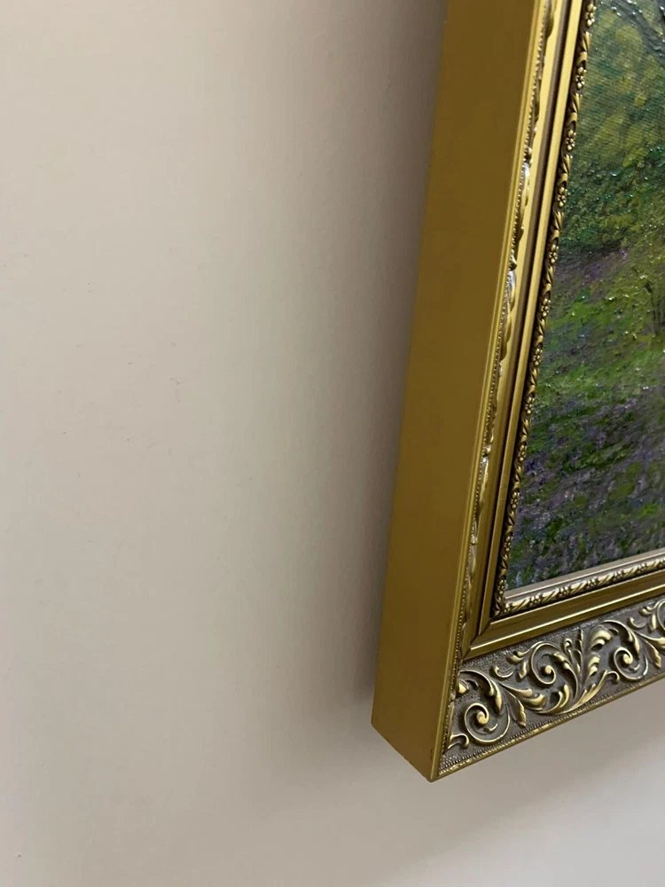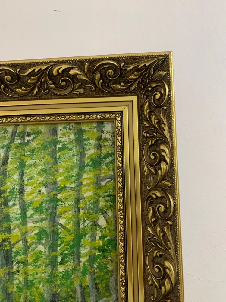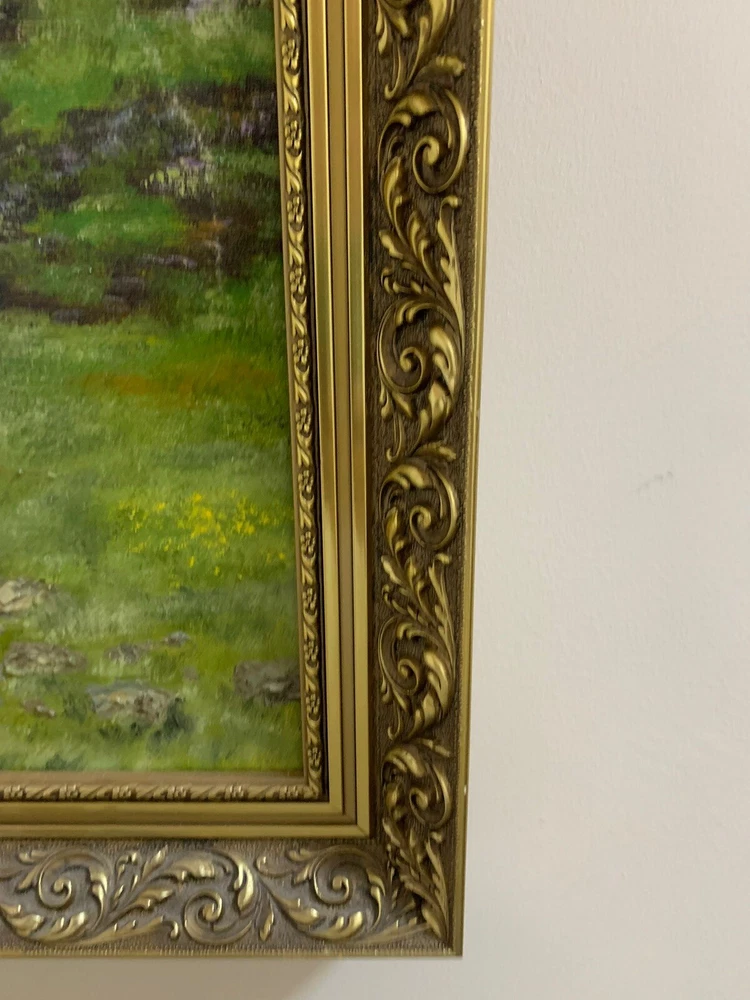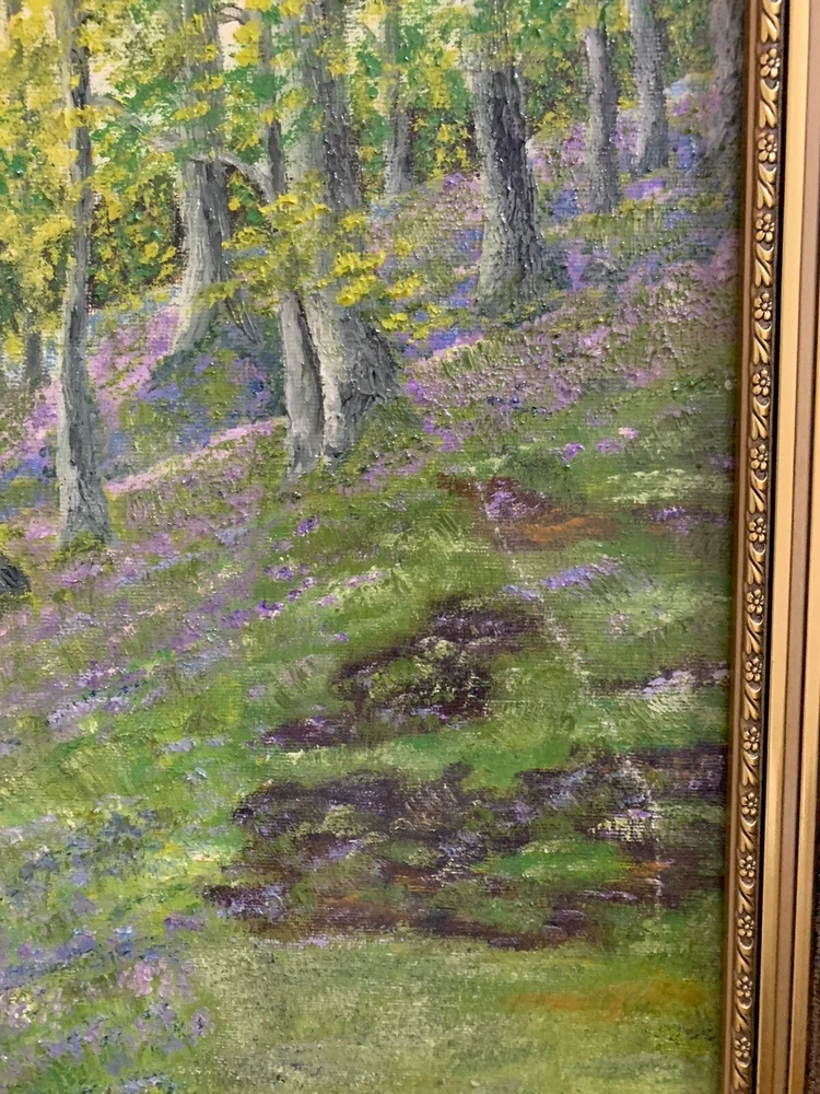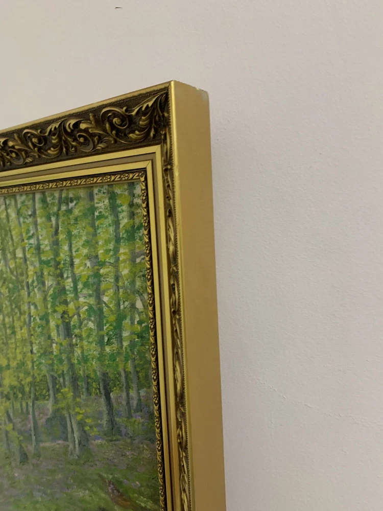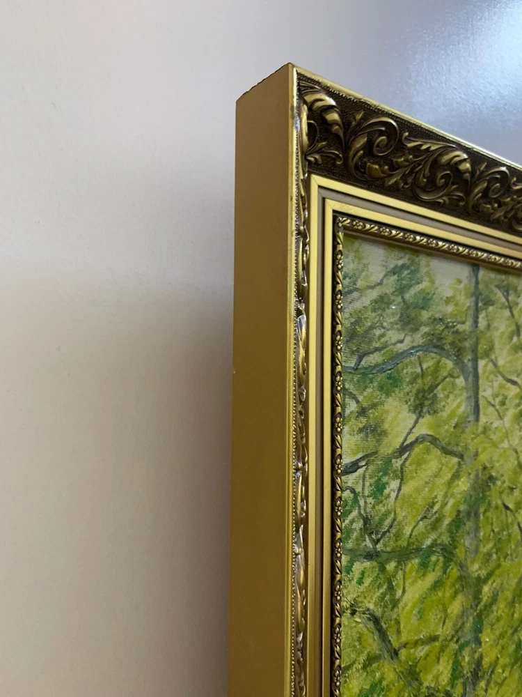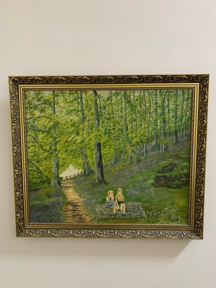 This stunning artwork by Reverend Kim Williams beautifully captures the tranquility of a woodland scene. The painting features a vibrant forest with a winding path and two figures resting on a stone bench, creating a charming and peaceful composition. The lush greenery and meticulous details bring the setting to life, evoking a sense of serenity and connection with nature. Measuring 58.5 cm in height and 68.5 cm in width, the artwork is set in an ornate gold-tone frame that compliments its timeless appeal. Perfect for art collectors or anyone looking to add a touch of countryside beauty and storytelling to their home. A fine example of Reverend Kim Williams' artistic talent and ability to portray the beauty of natural settings. We take great care to provide accurate descriptions, and we encourage you to thoroughly review the accompanying photos for a comprehensive understanding of the item's details. If you have any questions or need additional information, please don't hesitate to reach out to us.