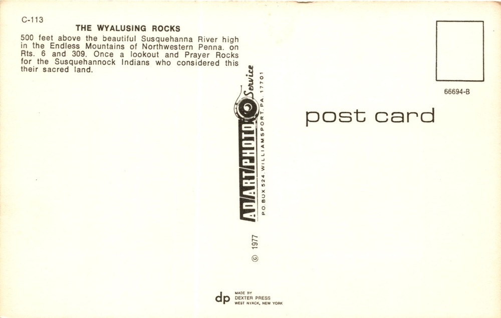 MAKE AN OFFER. THE MORE YOU BUY THE BETTER DEAL I WILL ACCEPT The postcard features a view of the Wyalusing Rocks, located 500 feet above the Susquehanna River in the Endless Mountains of Northwestern Pennsylvania. The rocks served as a lookout and prayer site for the Susquehannock Indians, who revered the area as sacred.