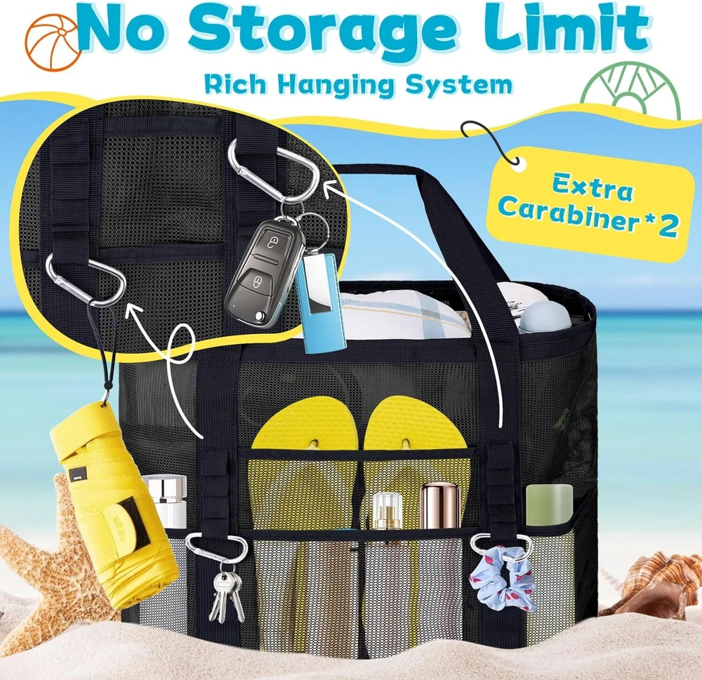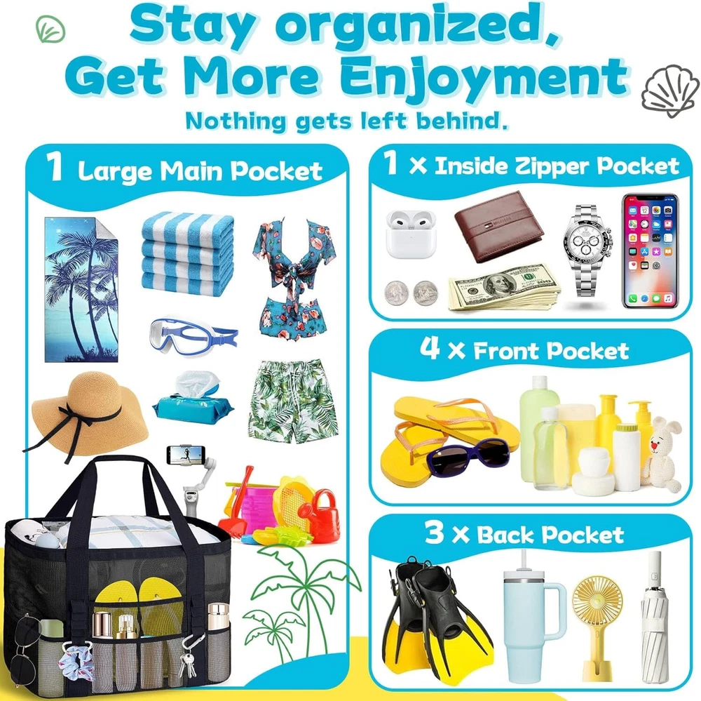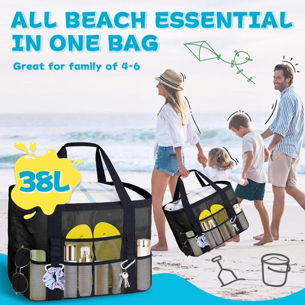 XX-Large Mesh Beach Bag Tote with 9 Pockets for Vacation/Travel & Black