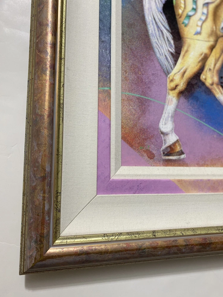 ARTIST: Yankel Ginsburg TITLE: Carousel MEDIUM: Limited edition lithography on board, no glass needed. Hand signed by the artist and numbered. SIZE: 36 x 40 1/2 framed. PRICE: $4000 Great condition. Asking below cost! Art was purchased directly from Yankel Ginsburg at his home studio. Ginzburg’s creations are unique, both his paintings and sculptures are images superimposed on each other, an intertwining of symbols and shapes, abstract and surrealistic and airbrush technique. Ginsburg has had numerous one man exhibitions around the world. His art is displayed in many museums, worldwide.