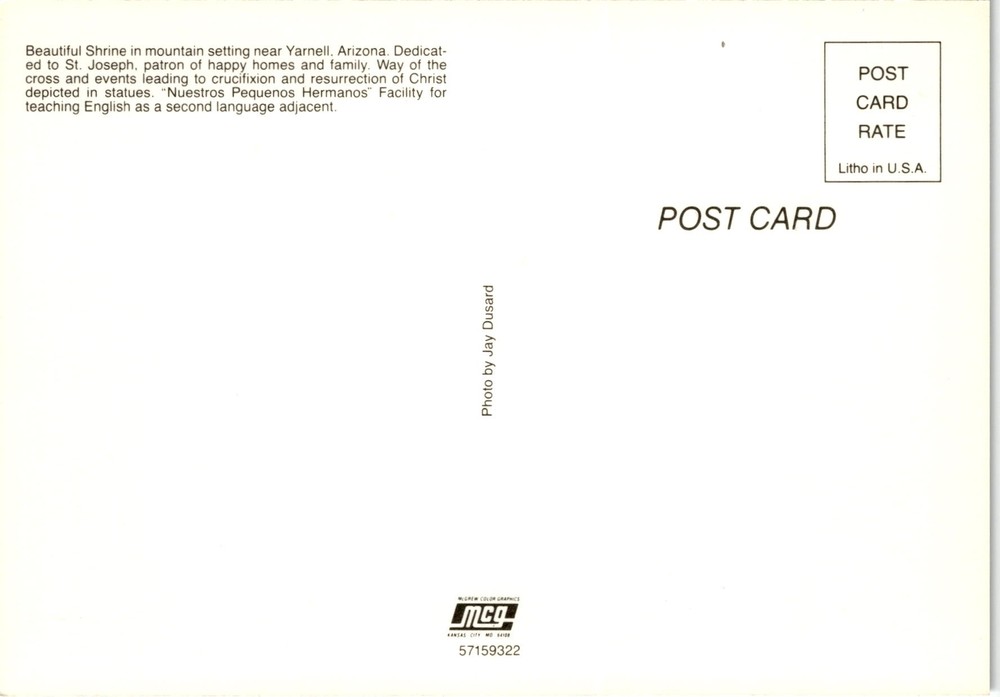 MAKE AN OFFER. THE MORE YOU BUY THE BETTER DEAL I WILL ACCEPT The postcard describes a beautiful shrine in a mountain setting near Yarnell, Arizona, dedicated to St. Joseph, the patron of happy homes and families. The shrine features statues depicting the Way of the Cross and events leading to the crucifixion and resurrection of Christ.