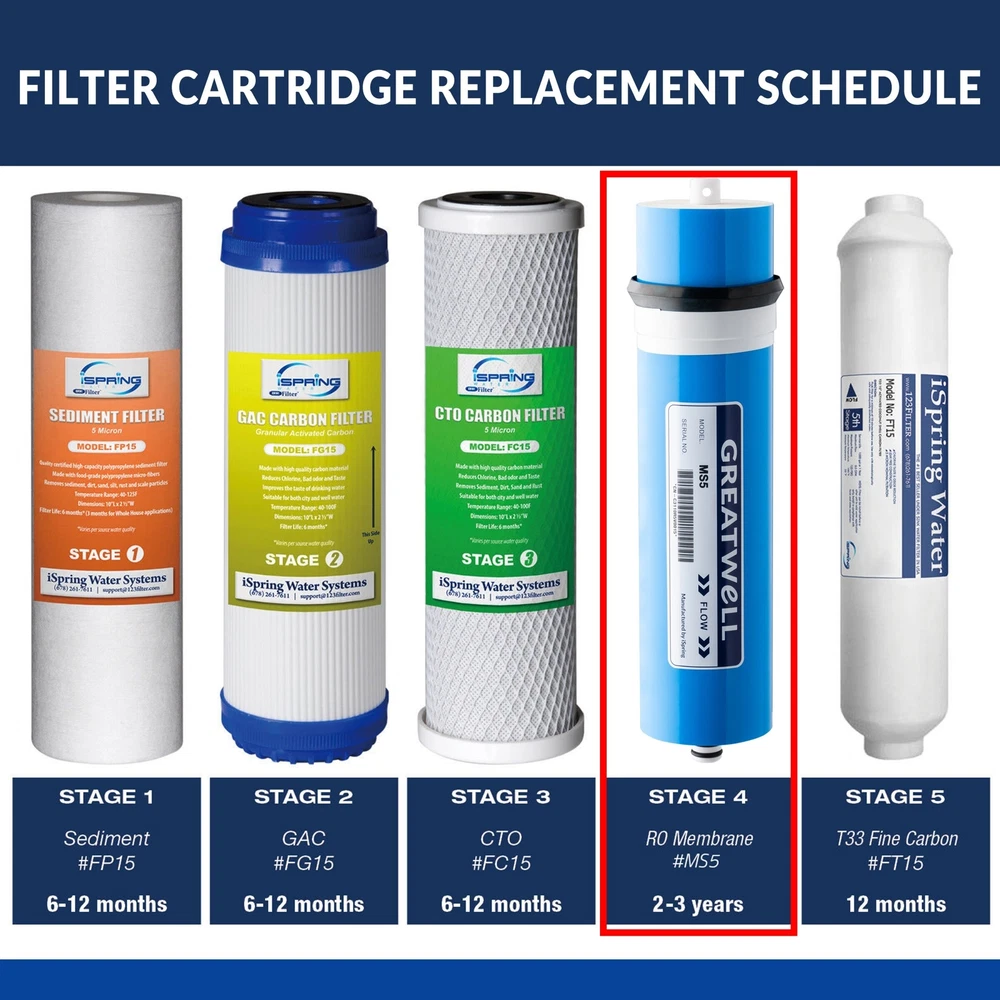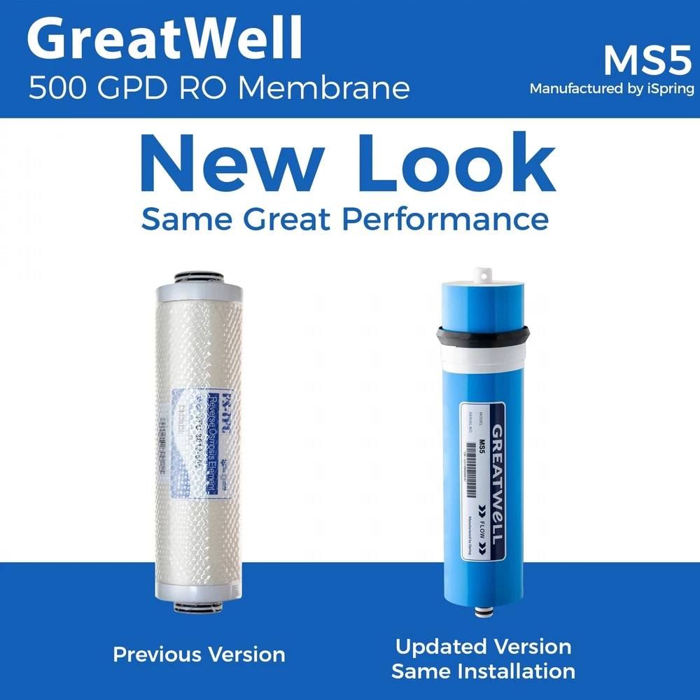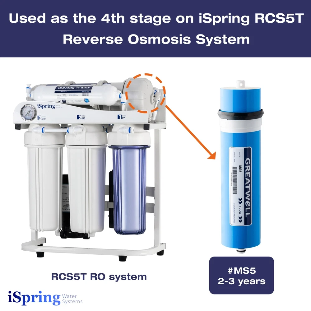 Features: Advanced 500GPD membrane saves 60% of water, with 1:1 drain to clean water ratio Low-pressure and high-capacity membrane for tankless direct ro output Fits iSpring light commercial RO system RCS5T Rejects wide spectrum of impurities down to .0001 micron Tolerance to a wide range of operating conditionsThis is the key component of the iSpring commercial reverse osmosis water purification system, usually used in the 4th stage. It has very tiny holes, which allow only water and a few gases to pass through under certain pressure thus produces virtually pure water. The technology has been used in spaceships to recycle water for astronauts. It is effective in reducing hardness, heavy metals, toxins, free chlorine, bad taste, odor THM, organics, hazardous chemicals, and pesticide. Free Shipping Over $49.99* Details iSpring 2.8"x12 500GPD RO Membrane, Fits RCS5T Product Description: Features: Advanced 500GPD membrane saves 60% of water, with 1:1 drain to clean water ratio Low-pressure and high-capacity membrane for tankless direct ro output Fits iSpring light commercial RO system RCS5T Rejects wide spectrum of impurities down to .0001 micron Tolerance to a wide range of operating conditions This is the key component of the iSpring commercial reverse osmosis water purification system, usually used in the 4th stage. It has very tiny holes, which allow only water and a few gases to pass through under certain pressure thus produces virtually pure water. The technology has been used in spaceships to recycle water for astronauts. It is effective in reducing hardness, heavy metals, toxins, free chlorine, bad taste, odor THM, organics, hazardous chemicals, and pesticide. Depending on inlet water quality or flow rate, it needs to be replaced every 24 months or 48,000 gallons of water. State-of-the-art 500GPD membrane enables full contact of water with the membranes. Increases water production by 15%, while reducing waste water by 60%, more environmental friendly with a 1:1 drain to clean water ratio. Why iSpring located in Alpharetta, Georgia for over a decade, iSpring water systems LLC is a family owned company specializing in reverse osmosis water filtration systems. Our products include residential and commercial reverse osmosis (ro) systems, whole house water systems, Ultrafiltration systems, shower, faucet, and counter top filters, filter cartridges and housings, ro coolers, and kitchen faucets and fittings. Our aim is to make high quality drinking water accessible for all households. With affordable pricing, solid quality, Prompt delivery, and top notch customer service, we hope to assist in bringing you great water for years to come.