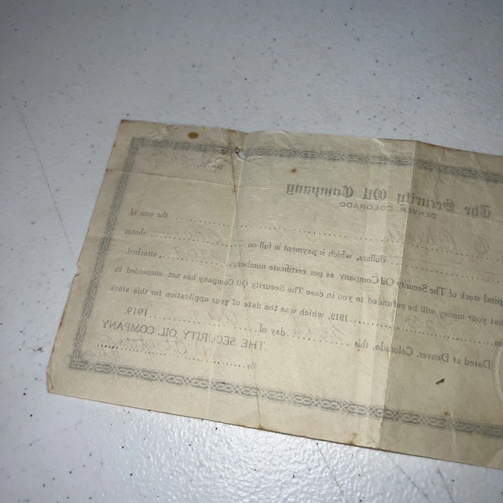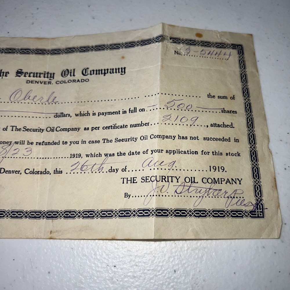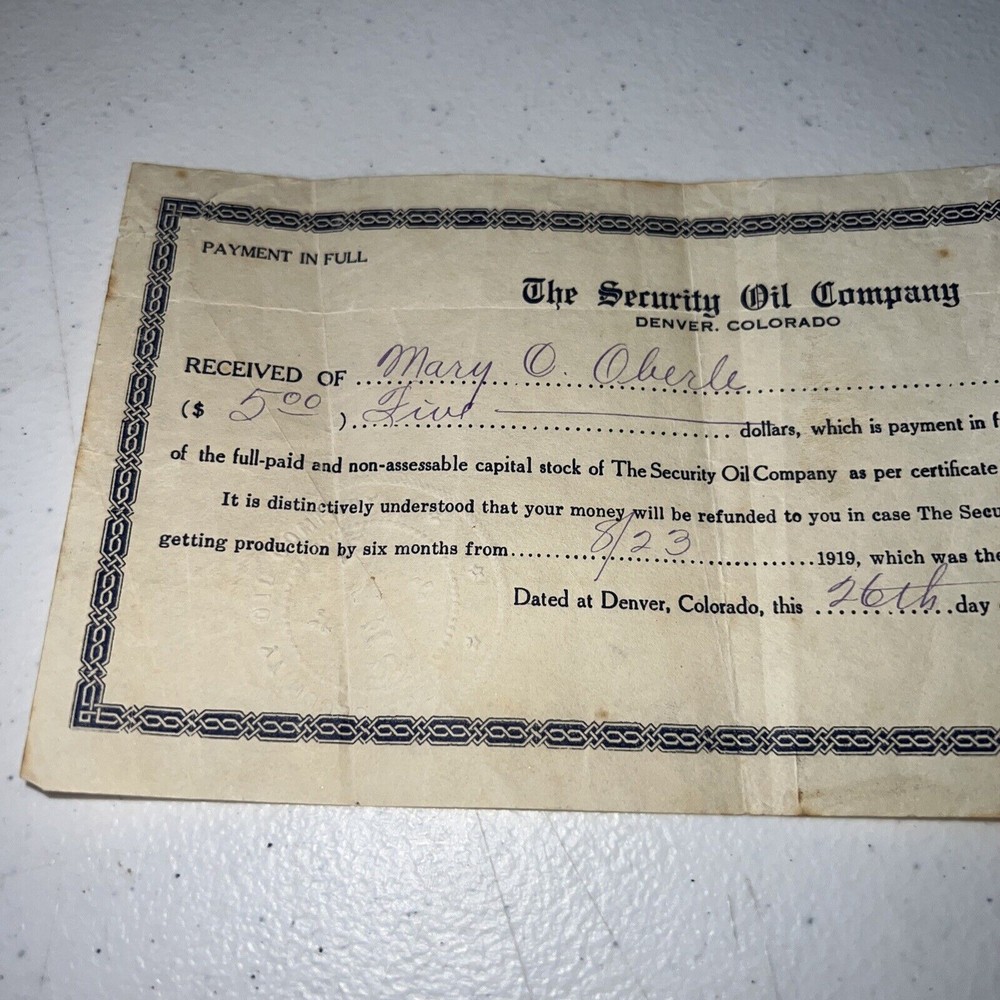 Delve into the rich history of American industry with the Security Oil Company payment in full receipt from 1919, a tangible piece of history for collectors and enthusiasts alike. This circulated stock receipt, numbered 5444, represents a time when the Security Oil Company was a powerhouse in the energy sector, reflecting the era's economic landscape and industrial might. Originating from the United States, this item is an authentic slice of the past, unmodified and preserving its original form. It's a must-have for those who appreciate the heritage of American business and the evolution of the oil industry. Add this 1919 Security Oil Company receipt to your collection and own a piece of the historical tapestry of commerce. as is no returns
