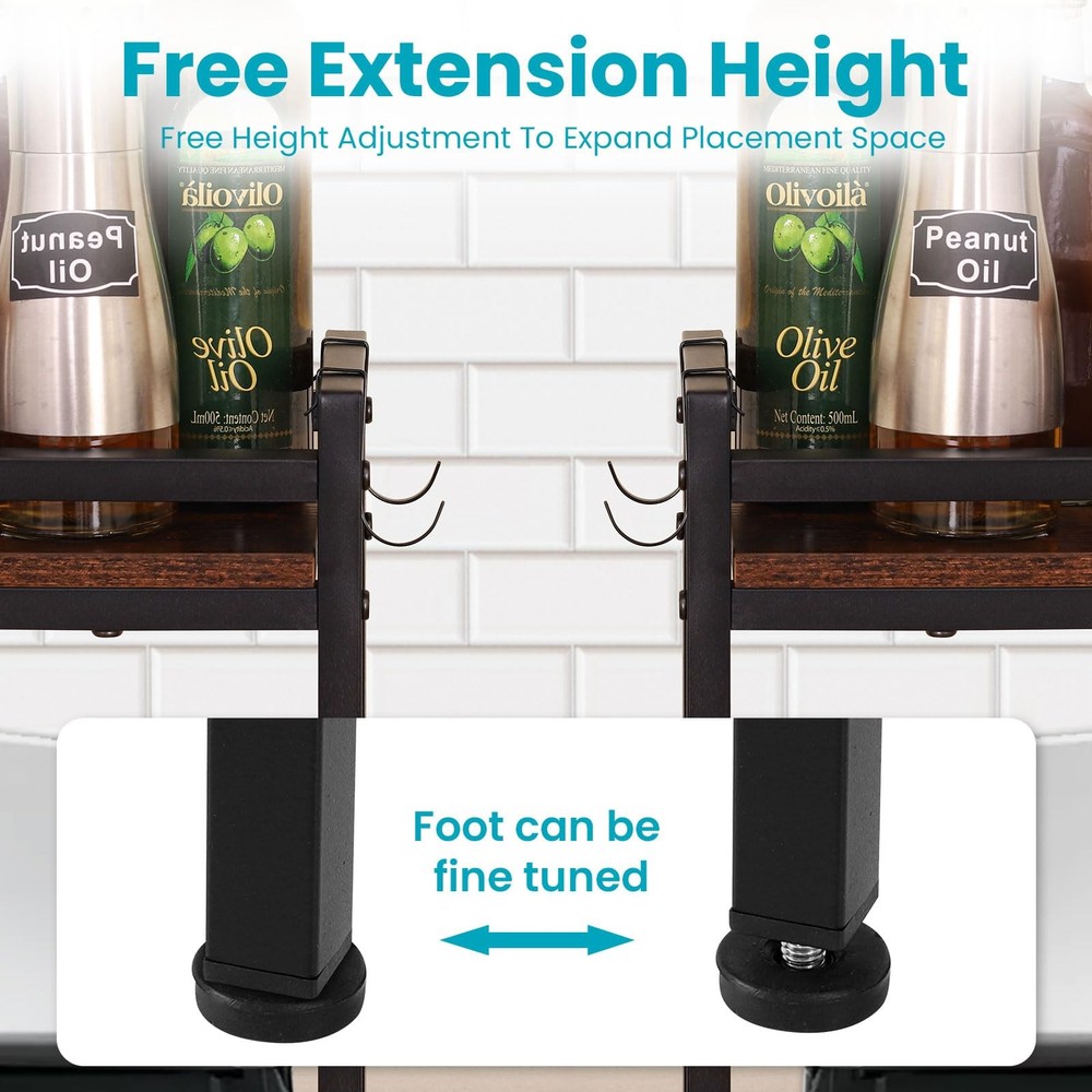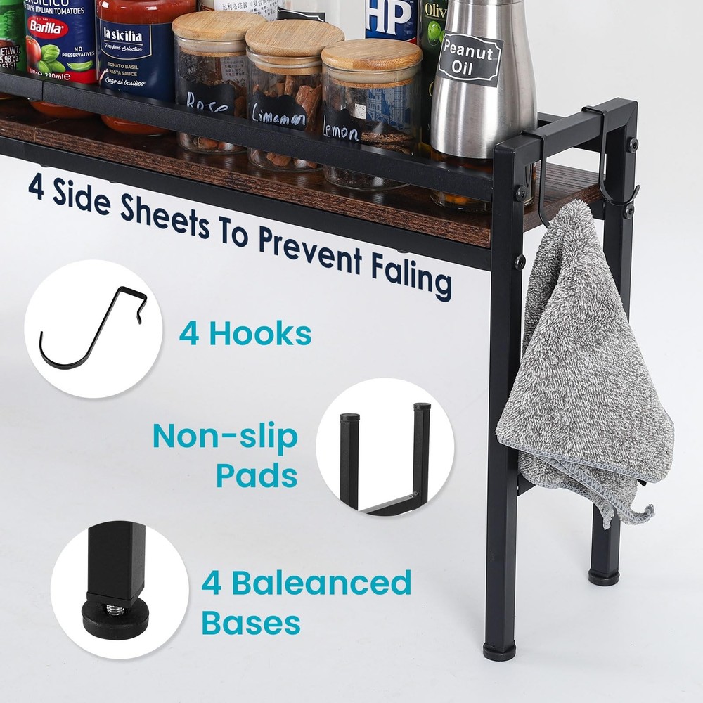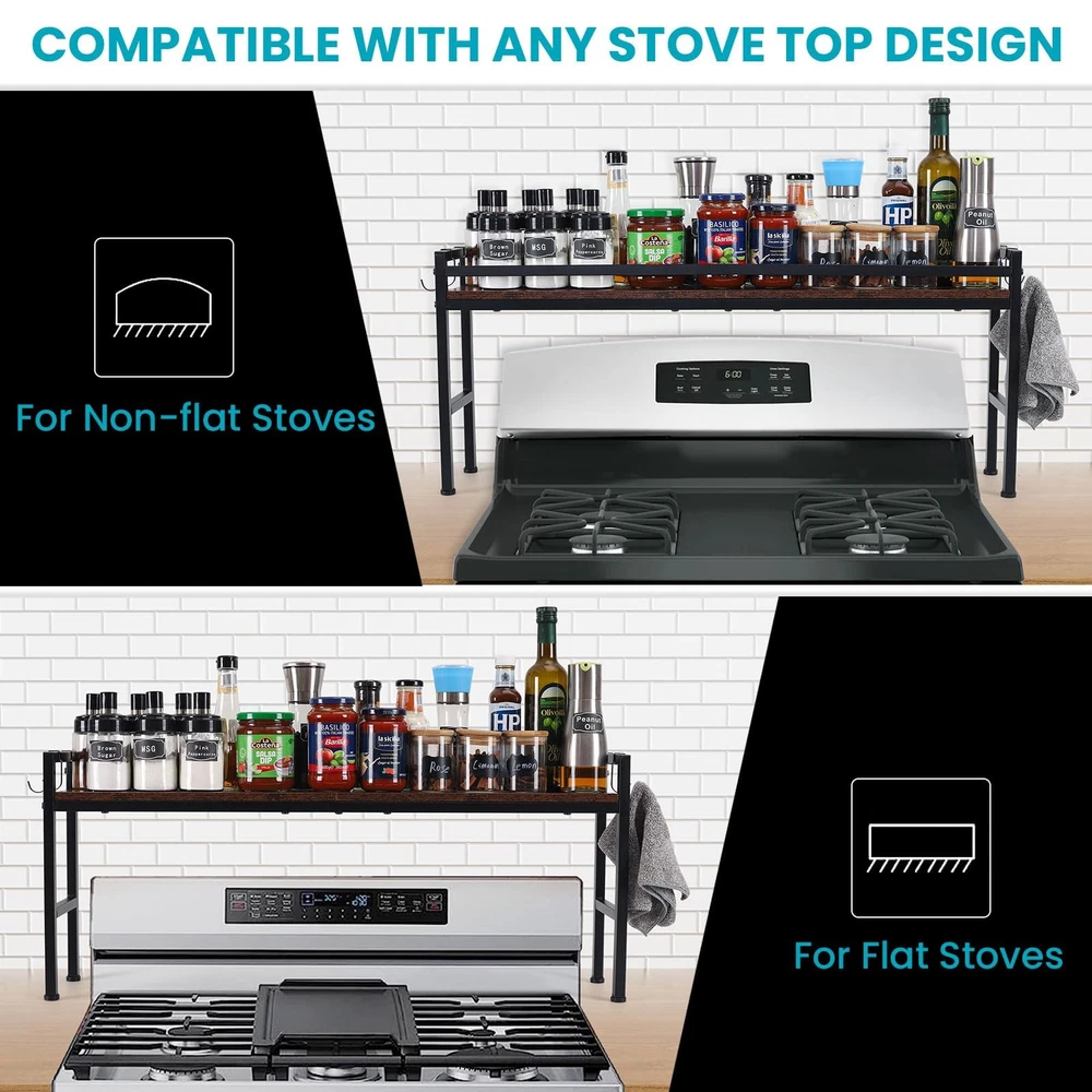 Stove Shelf Description Transform your kitchen with our versatile stove shelf, designed to provide immediate additional storage and display space. Whether you have a flat, uneven, tilting, or built-in cooking stove, this shelf is compatible with all types of stovetops, ensuring a perfect fit for your needs. Stability and Balance - Featuring adjustable leveling feet, our stove shelf offers unmatched stability and balance. Simply adjust the feet to achieve a perfectly balanced setup, even on uneven surfaces, providing a steady foundation for all your culinary essentials. stove shelf with four hooks, this spice rack organizer is perfect for hanging kitchen utensils, pot holders, or small towels. Keep everything within arm's reach while maintaining an organized and tidy kitchen space. Elevate your kitchen's functionality and style with our stove shelf, providing the modernity and tidiness you truly deserve. stove shelf [Kitchen Organization] - This versatile stove shelf provides immediate additional storage and display space, enhancing the organization of your kitchen. Perfect for keeping spices, condiments, and cooking utensils within easy reach, it transforms your culinary area with a modern and tidy aesthetic. [Optimize Your Kitchen Space] - Enhance your kitchen's efficiency with our stove rack shelf, crafted to maximize space for condiments and essential culinary tools. With four hooks and non-slip pads on the sides, you can efficiently organize your kitchen area. Easy assembly ensures seamless integration into your space. [Robust and Elegant]- Constructed from sturdy wood and metal, the sleek black coating infuses a modern charm into your kitchen setting. Engineered to withstand daily wear, it effortlessly elevates the allure of your cooking space. adjustable leveling feet-This stove shelf adjustable leveling feet provide stability and balance,Simply adjust the feet accordingly for a perfectly balanced setup. Widely Used-Whether you have a flat stove top, an uneven surface, a tilting stove top, or even a built-in cooking stove, this rack is designed to meet your needs. With its universal compatibility, you can enjoy the convenience and functionality of organized kitchen storage regardless of your stove type.